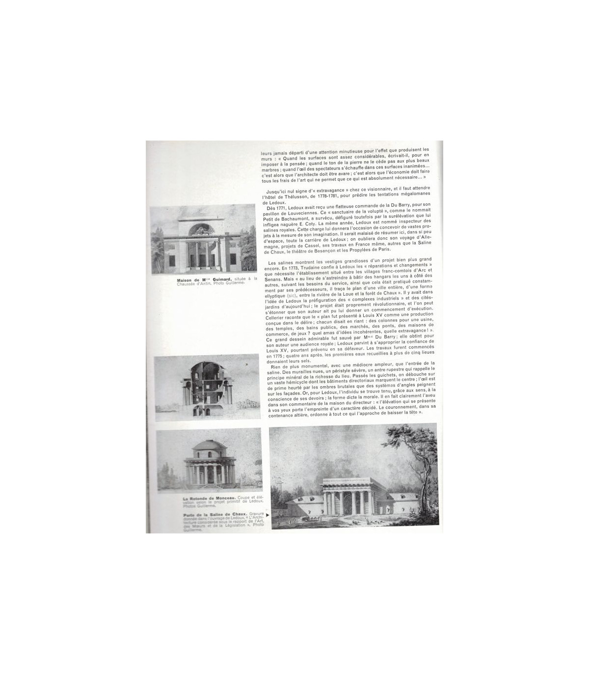 Architecte Ledoux : 1960 nous apporte un centenaire qui attriste les amoureux de l'architecture française. Il y a cent ans, un décret impérial abolissait l'octroi de Paris; les "barrières" bâties par Ledoux, dont un grand nombre subsistaient, furent vouées à la démolition. Ainsi disparurent la plupart des spécimens de la féconde activité parisienne d'un architecte génial: d'une soixantaine de monuments qu'il éleva dans la capitale, il ne reste que les barrières de Denfert et du Trône, les rotondes de Monceau et de La Villette, et l'hôtel d'Halwayll, dont on peut voir les restes, rue Michel-Lecomte - Brasilia : le Brésil vient de céléberer le transfzet de sa capitale administrative de Rio de Janeiro à Brasilia, ville entièrement neuve, dont pas une pierre n'existait encore il y a quatrfe ans. Il s'agit d'un évènement considérable dans le domaine de l'urbanisme et de l'architecture - l'église de Kariyé Camii à Constantinople - Climat dans lequel est placé l'artiste aujourd'hui -