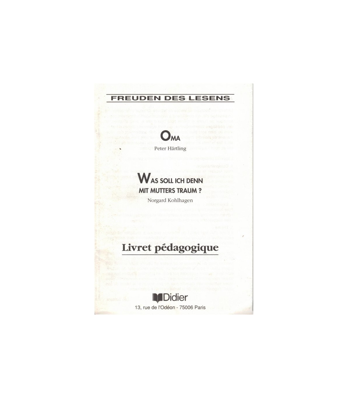 Oma, Peter Härtling, Livret pédagogique - oer die Geschichte von Kalle, der seine Eltern verliert und von seiner Grossmutter aufgenommen wird - Was soll ich denn mith Mutters Traum, Norgard Kohlhagen - livre du professeur, livre du maître - collection Freuden des Lesens. édtions Didier 1991. #manuels d'allemand, #littérature allemande, #livre du maître, #livre du professeur, #Freunden des Lesens, #deutsche Litteratur.