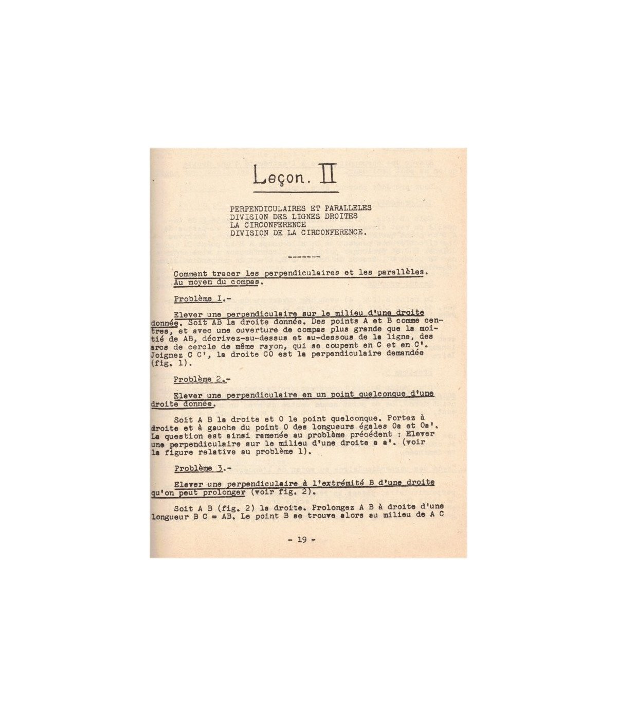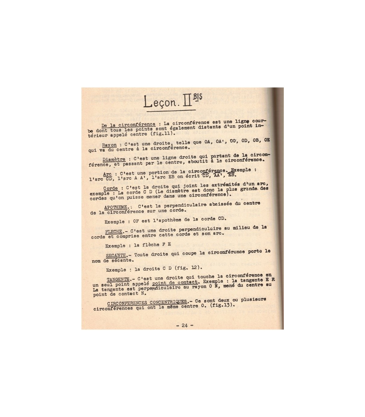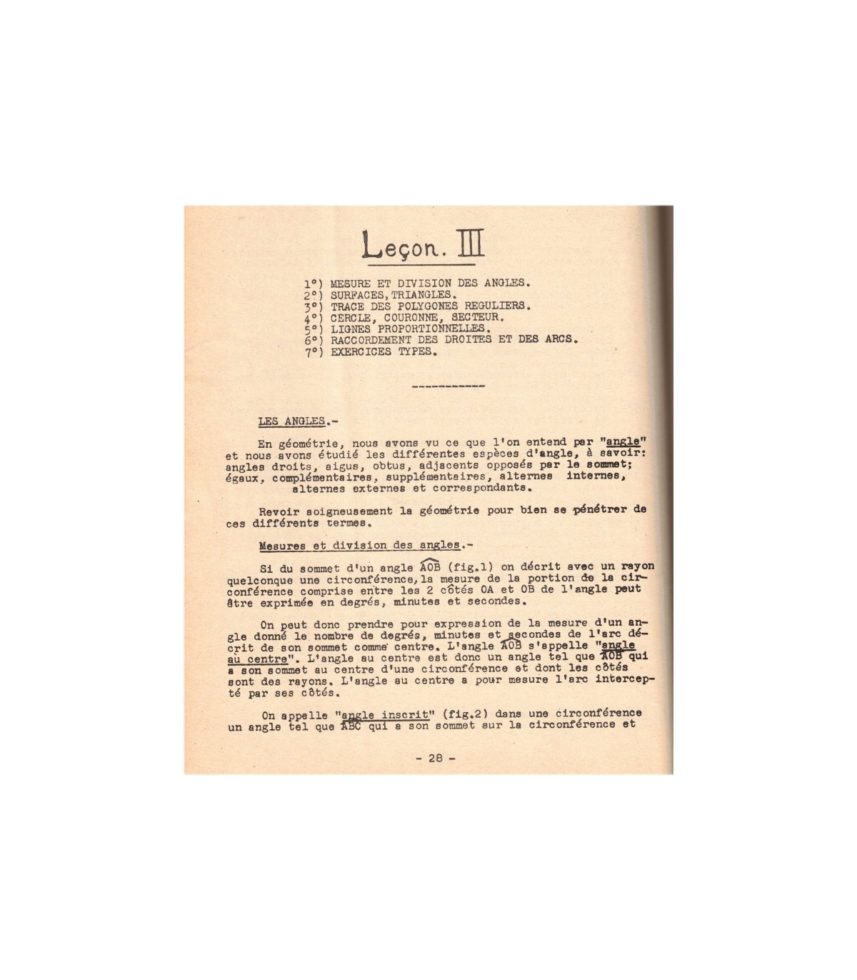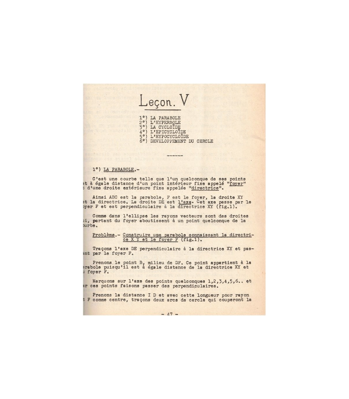 *Outillage du dessinateur, examen des divers instruments, croquis cotés, échelles, tracés - Perpendiculaires et parallèles, division des lignes droites, la circonférence, division de la circonférence - Mesure et division des angles, surfaces, triangles, tracé des polygones réguliers, cercle, couronne, secteur, lignes proportionnelles, raccordement des droites et des arcs, exercices types - l'OVE, l'anse de panier, l'ellipse, la spirale, la volute - La parabole, l'hyperbole, la cycloïde, l'épicycloïde, développement du cercle - manchons d'accouplement, embrayages, transmissions par courroies, poulies, transmissions par chaines, etc... -