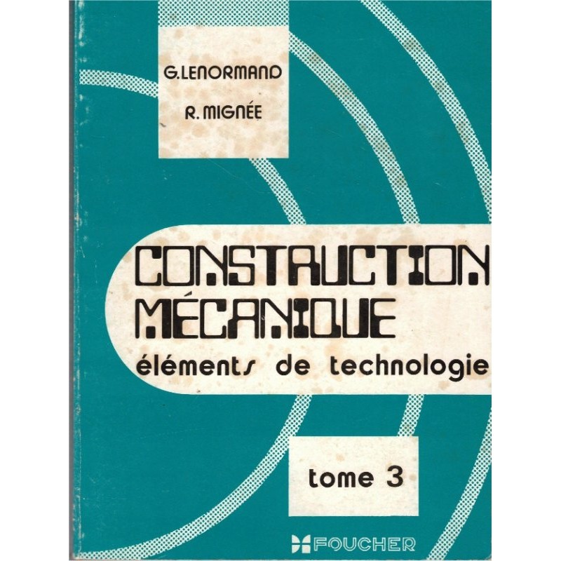Construction mécanique, éléments de technologie, par G. Lenormand et R. Mignée - tome 3, transmission du mouvement circulaire. Organes de machines - I. Transmission du mouvement circulaire sans modification de la vitesse angulaire : arbres de transmission et leurs guidages - accouplement des arbres - organes de ralentissement du mouvement - II. Transmission du mouvement circulaire avec modification de la vitesse angulaire : couples fonctionnant par adhérence - couples fonctionnant par obstacle - organes mécaniques de modification de vitesse. Les éditions Foucher, Paris, 1971. #dessin industriel, #manuel de technologie, #enseignement technique, #lycées techniques, #manuels enseignement professionnel, #mécanique, #manuels de mécanique.