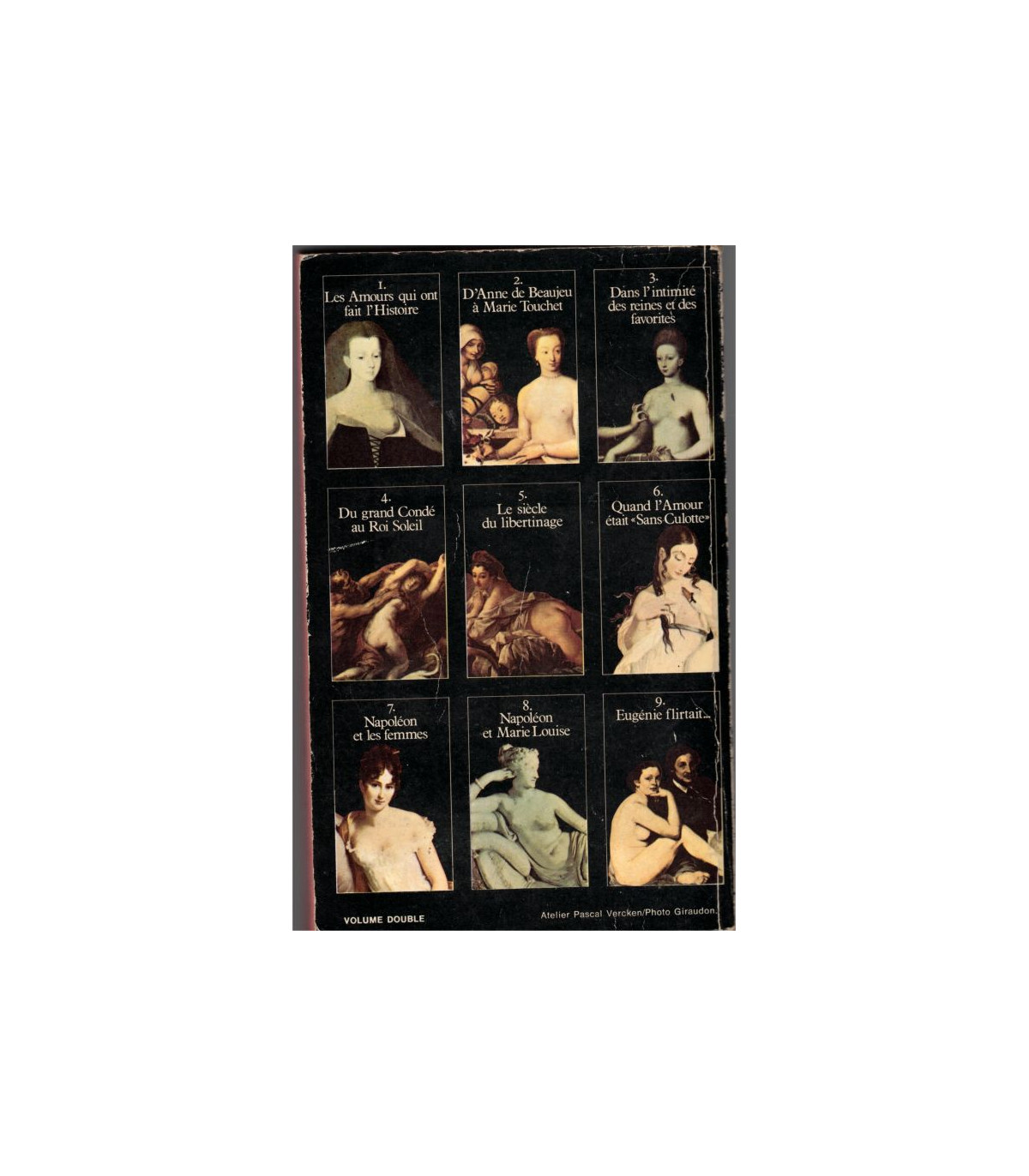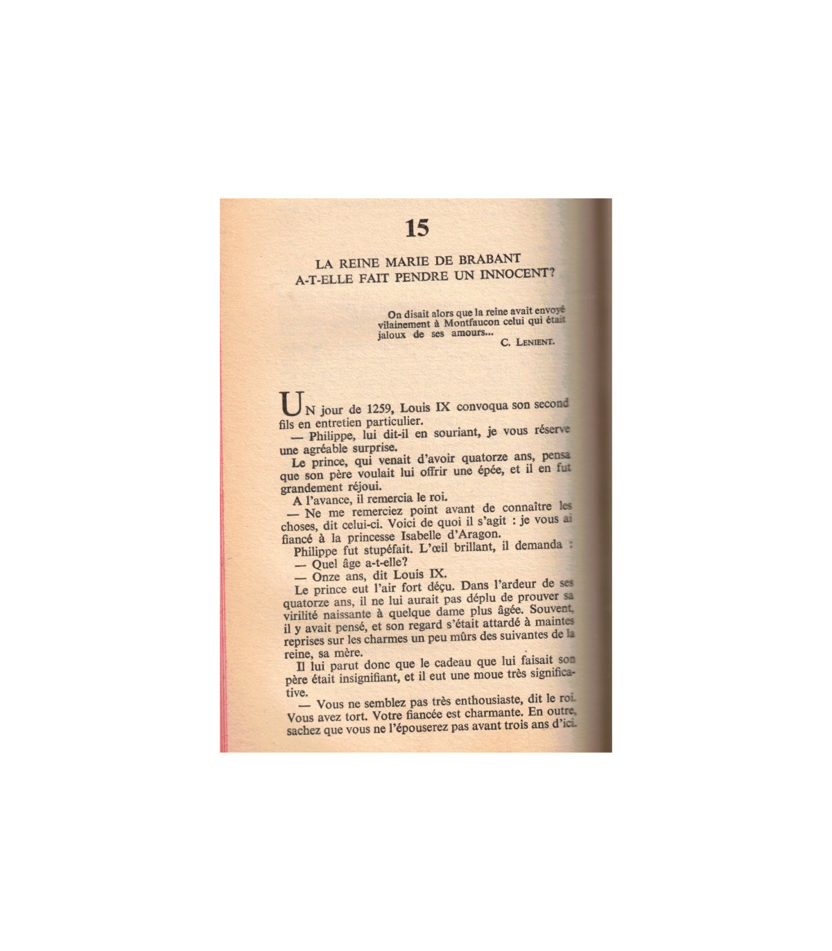 Clovis aurait pu dire Clotilde vaut bien une messe - Frédgonde et Brunehaut, deux reines cruelles et débauchées - Nanthilde fut la reine la plus trompée de l'Histoire - Charlemagne, enfant de l'amour - les femmes de Charlemagne ont influencé sa politique - les concubines de Charlemagne - Parce que Louis a aimé Judith, la France est née - Robert le Pieux fut excommunié pour l'amour de Berthe - un jeune homme enlève une reine de France ; enlevez-moi dit Bertrade, et la France fut frappée d'interdit - Aliénor fut victime des nuits d'Orient - Au lendemain de leur nuit de noces, Philippe Auguste répudia Ingeburge - l'amour de Thibaut de Champagne pour Blanche de Castille sauva la couronne de France - Louis XV devait se cacher dans l'escalier pour aimer Marguerite de Provence - la reine Marie de Barbant a-t-elle fait pendre un innocent - A la Tour de Nesle, la reine Jeanne recevait des étudiants - les débauches de Marguerite de Bourgogne firent exclure les femmes de la Couronne - une femme est à l'origine de la guerre de Cent Ans - le roi de France épouse la fiancée de son fils - Jean le Bon mourut prisonnier des Anglais pour l'amour d'une jeune Londonienne - l'amour prépare un roi fou à la France - la reine Isabeau et ses amants trahissent la France - Isabeau donne aux Anglais l'idée de brûler Jeanne d'Arc - Agnès fait terminer la guerre de Cent Ans.