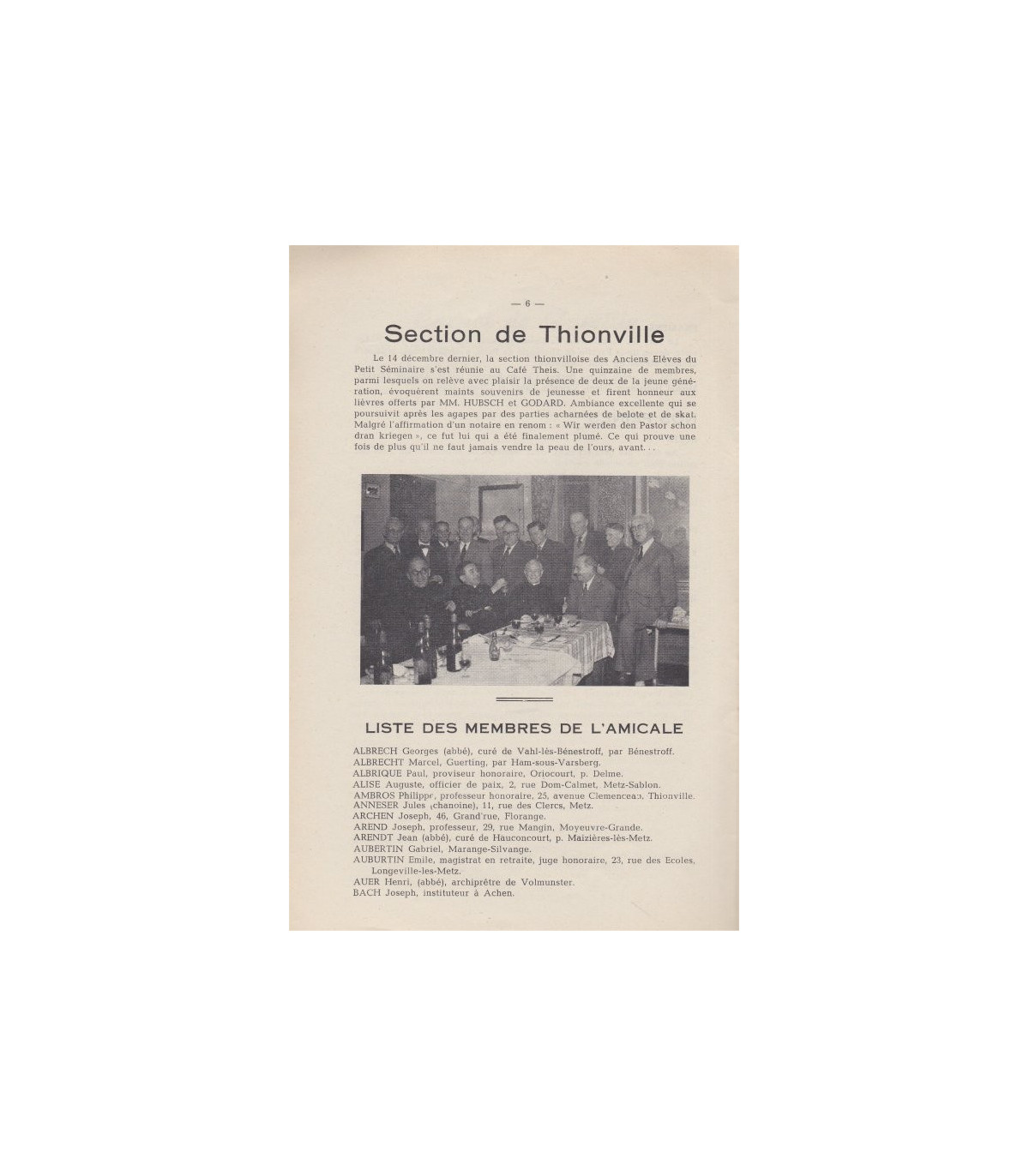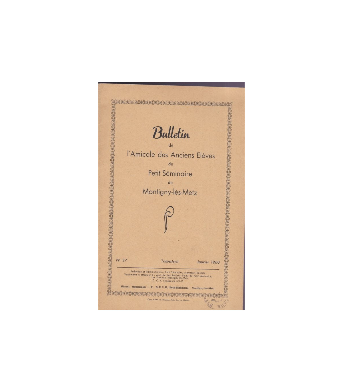 Bulletin de l'Amicale des Anciens élèves du Petit Séminaire de Montigny, N°37 janvier 1960 - Chronique estudiantine du premier trimestre - Carnet de famille - nos joies : distinction pontificale, canonicat, décoration, promotion, mariage, noces d'or, naissance, fiançailles, examen - Nos peines : décès, deuil. Section de Thionville, anciens élèves du Petit Séminaire de Thionville, liste des membres de l'Amicale (avec une photographie). Avec 13 pages d'annonces publicitaires de commerces locaux de Metz.