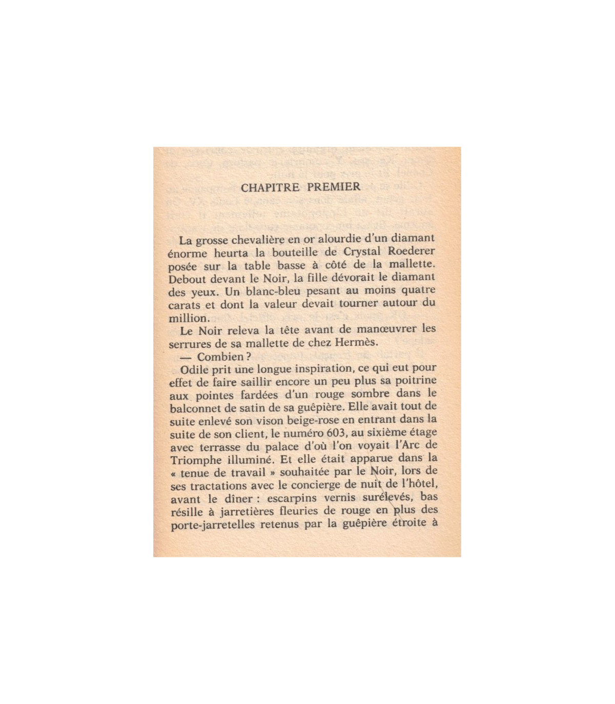 Son client haletait déjà. Cet énorme Gabonais la fascinait. Avec tous ces dollars dans une mallette ouverte à quelque pas... Il lui tendit une coupe de champagne. Sans un mot, du bout de sa langue rose, elle lapa longuement les gouttes qui perlaient sur le bord u verre. La voix de l'homme se fit rauque, impatiente : - Alors, belle panthère, ce soir, c'est le grand jeu ?"