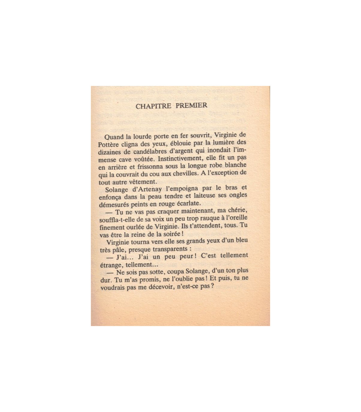 - Tu ne vas pas craquer maintenant, ma chérie, lui souffla Solange de sa voix un peu trop rauque. Tremblante, Virginie s'avança entre les deux rangées de fidèles, tous masquées, qui psalmodiaient une étrange litanie.