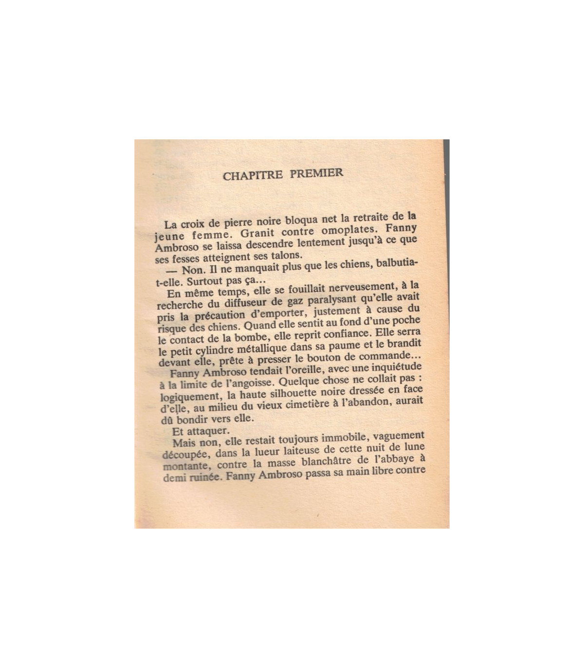 "De sa cachette, Fanny Arnbroso pouvait suivre l'étrange cérémonie qui se déroulait à la lumière des dizaines de bougies dans la vieille église désaffectée. La prêtresse avançait parmi les "amazones" prosternées, entonnant une incantation.