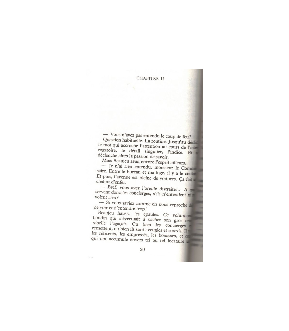"Il pleuvait sur Paris. Les rares passants se pressaient, courbant la tête sous les rafales, ou s'agrippant à leur parapluie que le vent menaçait d'emporter. M. Pater tâchait de hâter le pas, mais sa jambe raide le gênait. Dans son ciré noir, il luisait comme un monstre marin chaque fois qu'il passait sous un lampadaire. Son chapeau de feutre s'alourdissait et, de temps à autre, il se penchait pour l'alléger. La pluie, accumulée, tombait en cascade. Brièvement. Et des goutes perdues s'insinuaient entre le col de la chemise et sa peau. Une fraîcheur presque douloureuse le faisait frissonner.