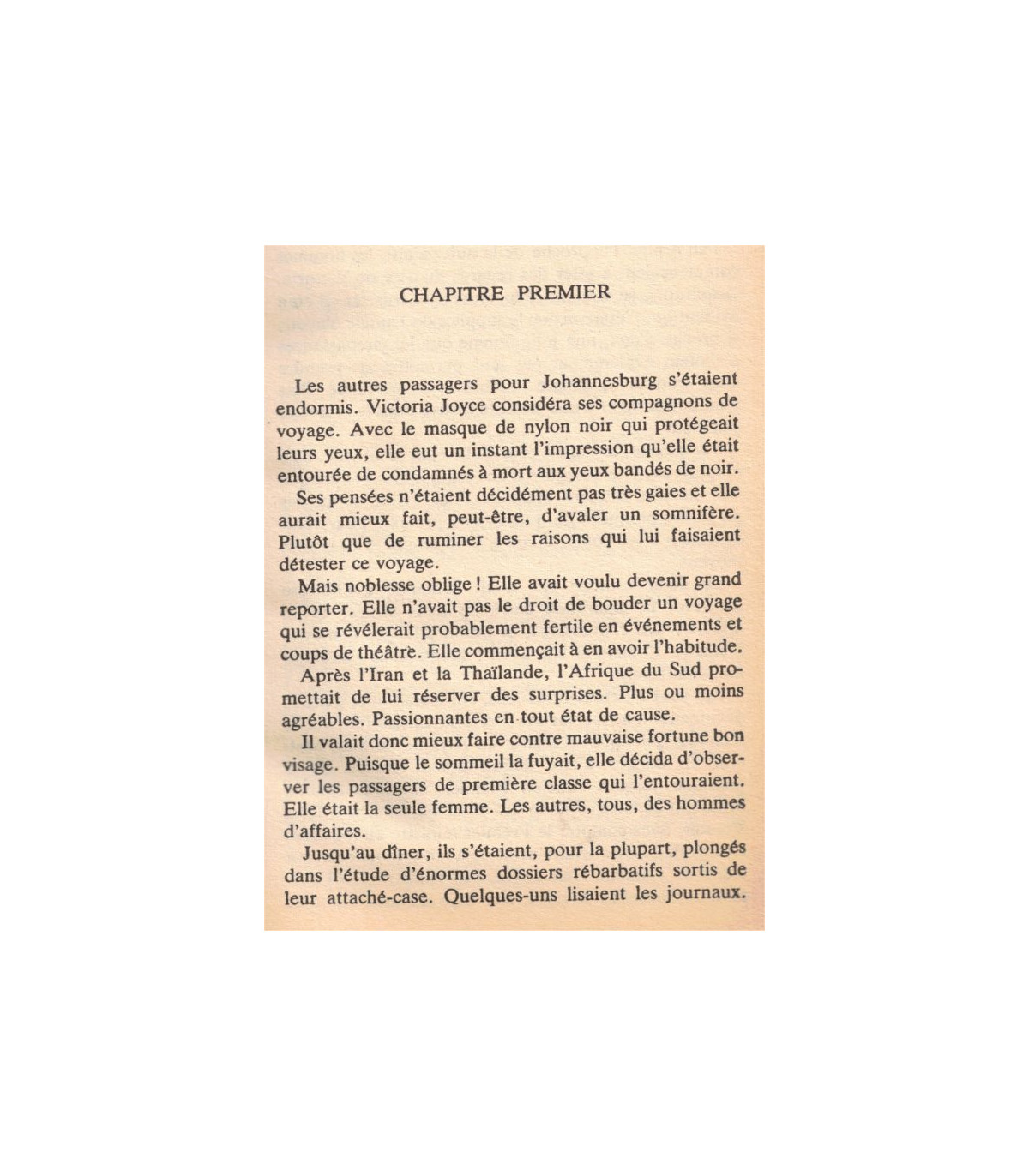 Plongée dans le pays de l'apartheid, parmi les descendants des Boers dont le puritanisme n'est qu'une aimable façade, Victoria Joyce est prise au piège. Venue enquêter sur l'énorme scandale des fonds secrets qui a bouleversé l'opinion publique sud-africaine, elle se voit transformée en bête traquée. On l'accuse de complicité, on veut la faire taire.