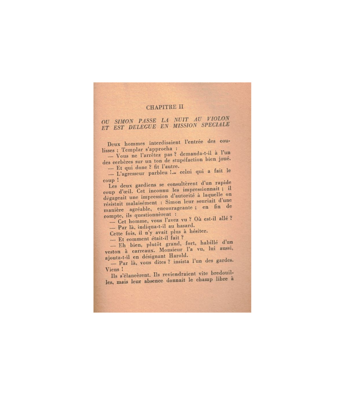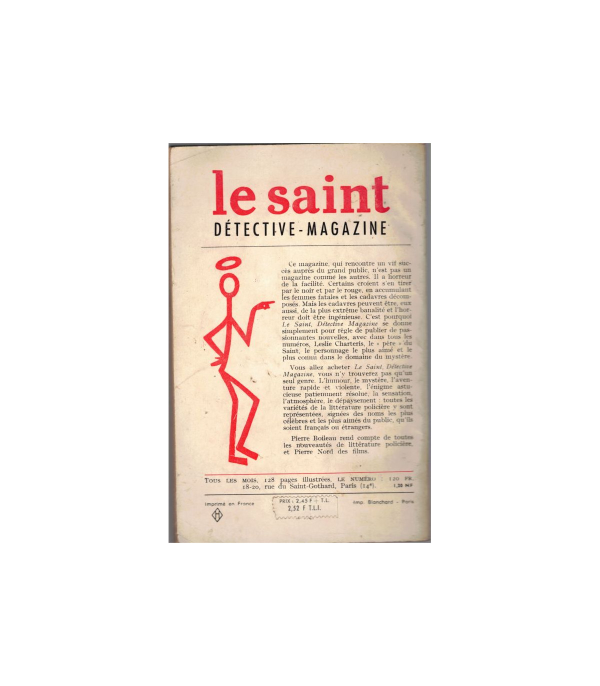 Nombre de gens s'accordent pour reconnaître en lui un moderne Robin des Bois. Pour beaucoup d'autres, le Saint était l'homme à rayer du nombre des vivants. Jusqu'à présent, ils n'y étaient pas parvenus, malgré l'emploi très rationnel de divers moyens de mort rapide tels que fusillade, strangulation, empoisonnement, pendaison, noyade, inhumation et autres. Et de cela, nos lecteurs le savent, Simon Templar est redevable à la protection de son ange gardien; celui-ci porte un attachement attendrissant à cet homme bizarre, toujours prêt à défier le pire pourvu que ce soit en faveur de quelque victime innocente. Si ladite victime possède un visage agréable et des formes charmantes, la résolution du Saint n'en est que plus vive."
