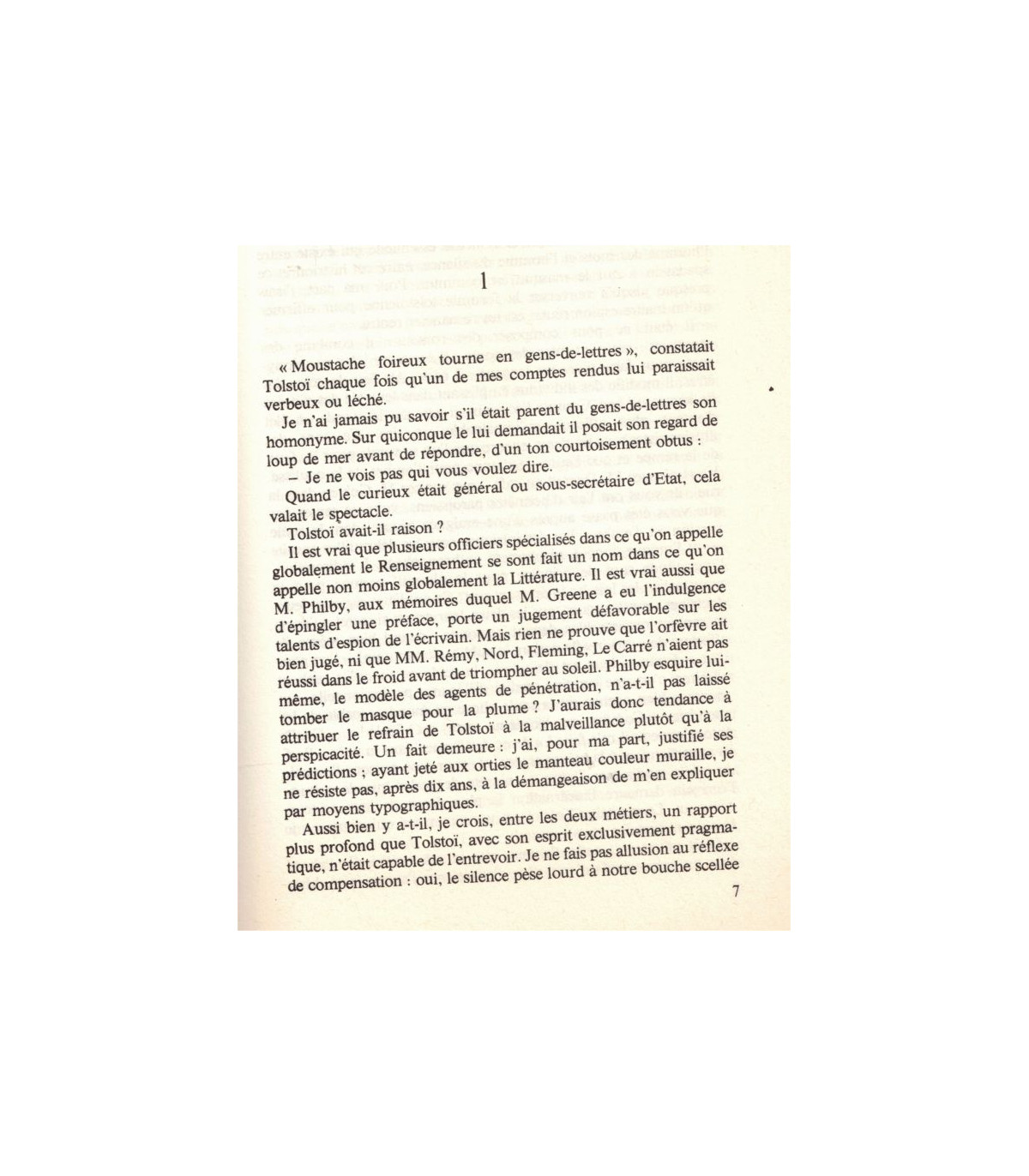 En même temps, il découvre le parallélisme qui existe entre le Renseignement et la Littérature, qui sont, l'un et l'autre, affaires de romancier. Car le rapport qui s'établit entre l'officier-traitant et son informateur s'apparente étrangement à celui qui unit l'écrivain et son personnage. D'où la réussite exemplaire d'écrivain de race comme Graham Greene, qui ont trouvé dans l'espionnage un monde à la ressemblance intime de leur talent.