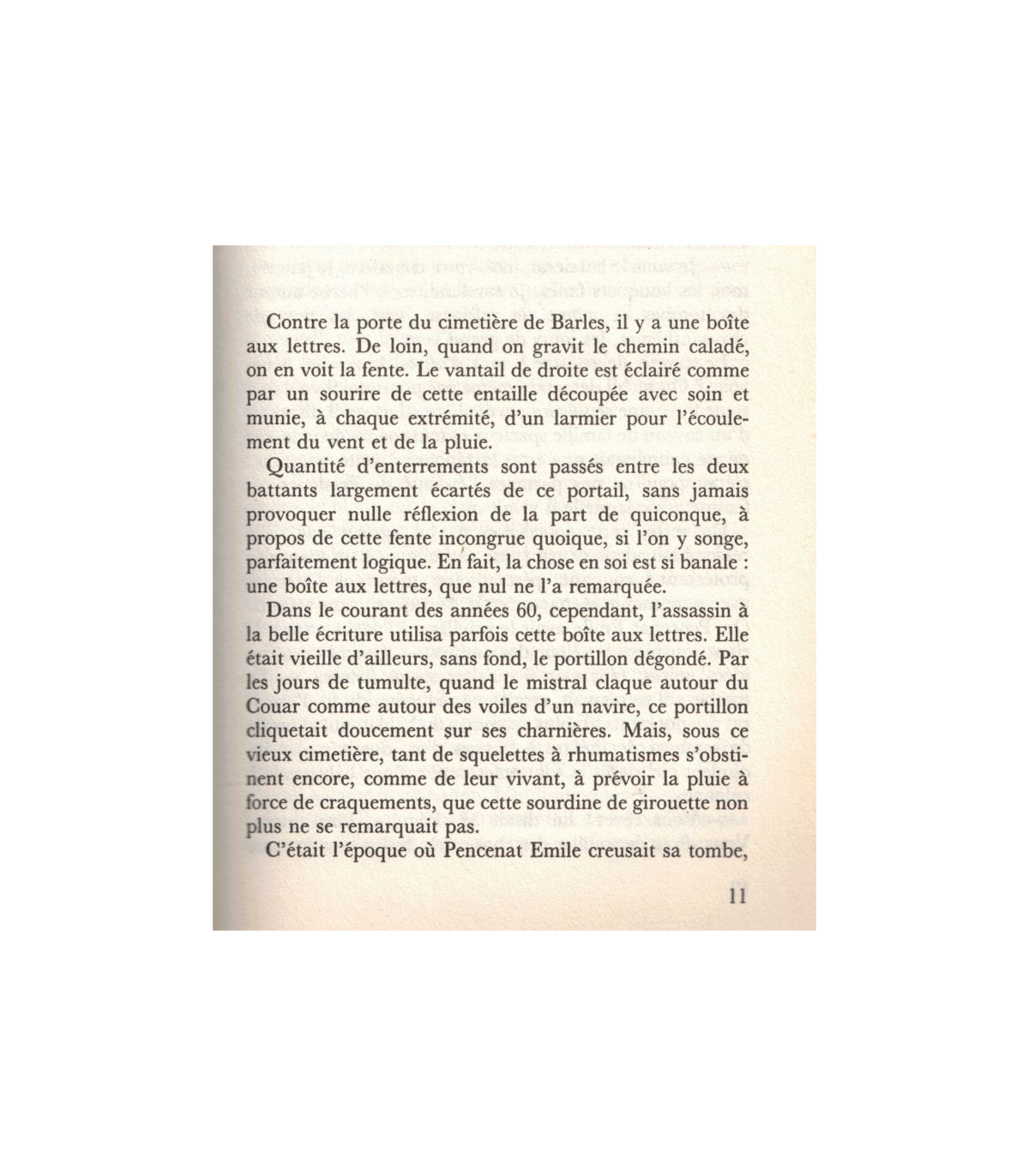 Dans le courant des années 60, l'assassin à la belle écriture utilisa parfois la boîte aux lettres désaffectée du cimetière de Barles, près de Digne. Pencenat Emile qui, en ce temps-là, dimanche après dimanche, creusait sa tombe, fut donc le premier à voir l'une de ces étranges missives, annonciatrices d'une vengeance à retardement assortie de la récupération d'un trésor fabuleux - et minuscule! - vieux de plus d'un siècle.