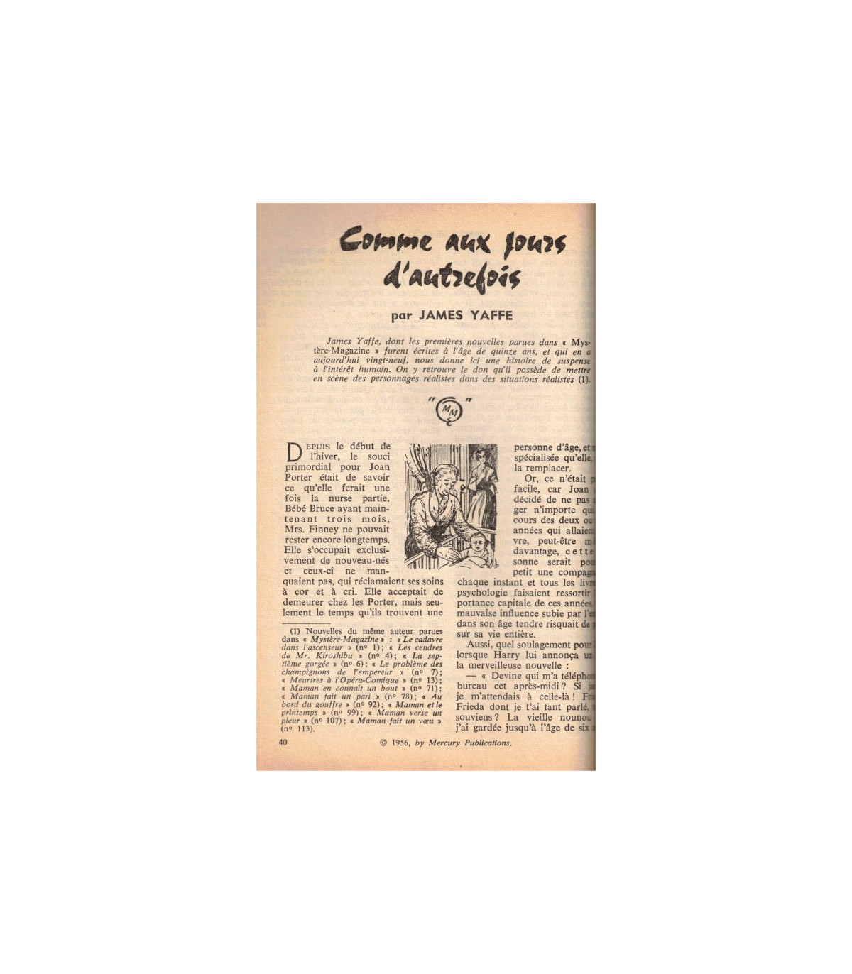 - Comme aux jours d'autrefois, par James Yaffe : James Yaffe nous donne ici une histoire de suspense à l'intérêt humain. On y retrouve le don qu'il possède de mettre en scène des personnages réalistes dans des situations réalistes -