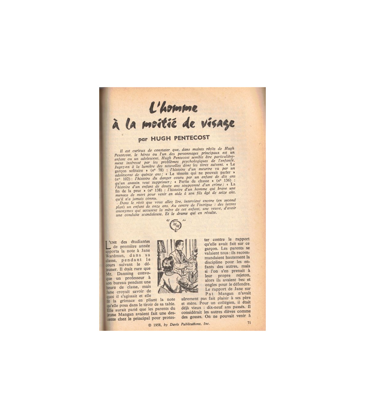 - L'homme à la moitié du visage, par Hugh Pentecost : Dans ce récit intervient en second plan un enfant de onze ans. Au centre de l'intrigue, des lettres anonymes qui accusent la mère de cet enfant, une veuve, d'avoir une conduite scandaleuse. Et le drame qui en résulte.