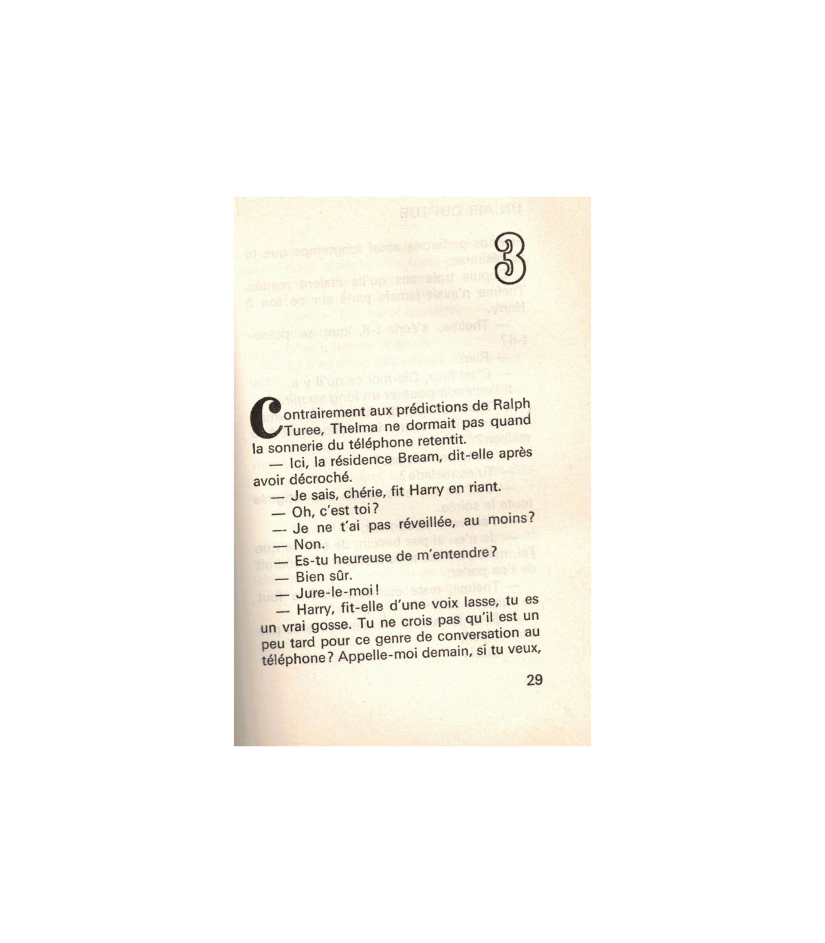 "Ron Galloway était occupé à boucler son sac de voyage dans sa chambre, lorsque Esther y pénétra. Elle allait dîner en ville et portait une nouvelle robe en taffetas rose brodé de perles, sur laquelle elle avait jeté une étole en vison blanc. - Ron? fit-elle.