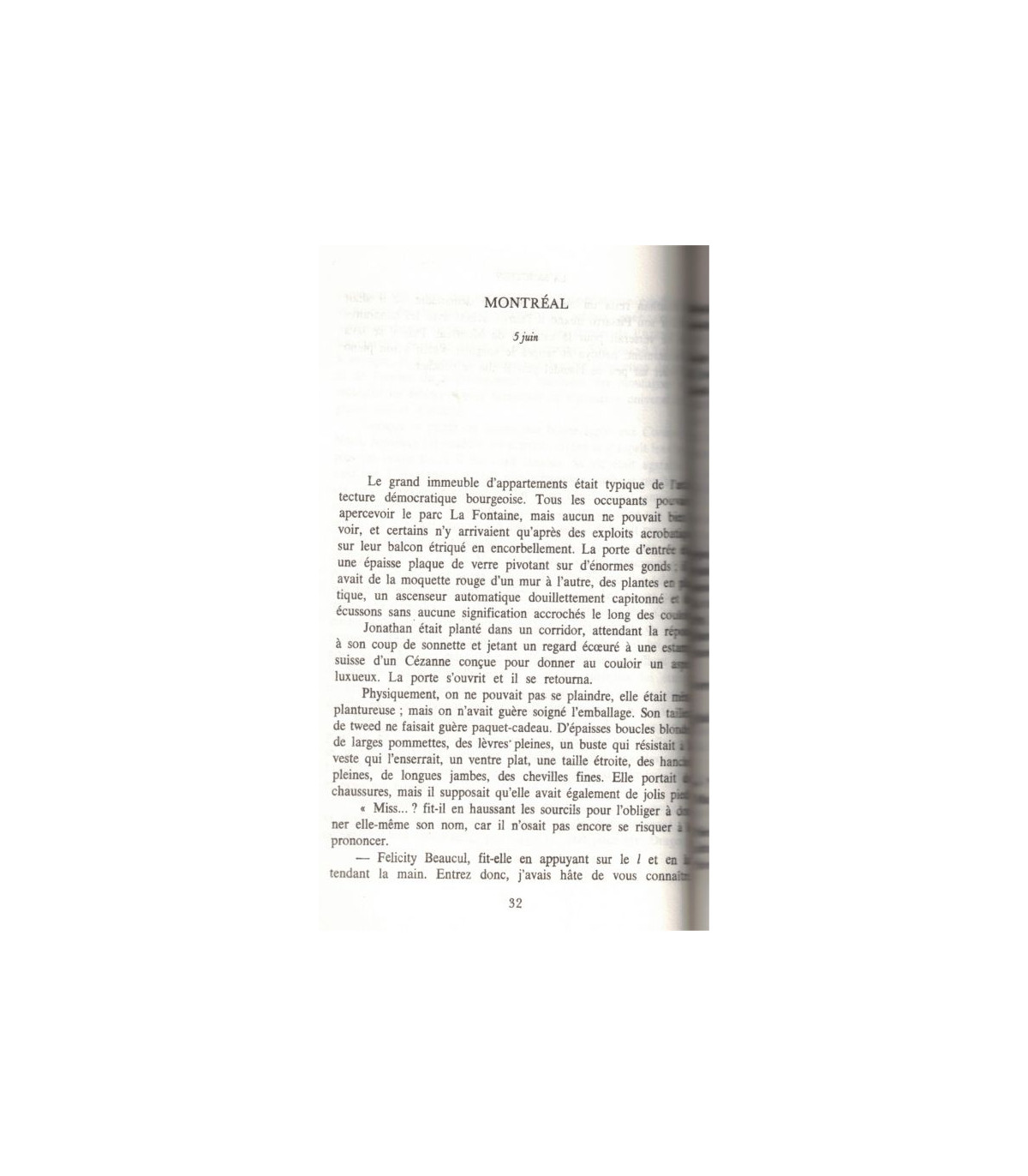 "Montréal, 16 mai - Au début de la soirée, la pluie était tombée sur le boulevard Saint-Laurent et il y avait encore des flaques triangulaires sur le trottoir bosselé. La pluie avait cessé mais il faisait encore assez frais pour justifier l'imperméable beige clair de l'agent CII Wormwood. Pour sa part, il préférait les trench-coats, mais il n'osait pas en porter, sachant que ses collègues du service se moqueraient de lui. Wormwood avait trouvé un compromis en relevant le col de son imperméable et en enfonçant profondément ses mains dans ses poches.