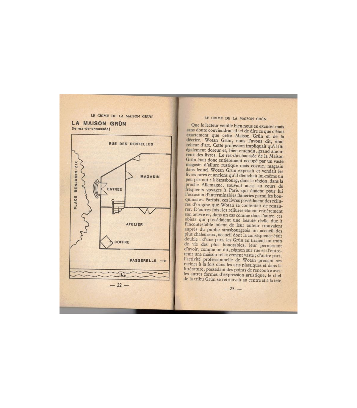 Bientôt, on l'entoura. La pauvre femme défaillait. D'un index tremblant, elle désigna les bords de l'Ill qu'une clarté lunaire livrait aux regards. On distingua d'abord comme un paquet de chiffons blancs et déjà l'on s'apprêtait à brocarder la vieille dame, lorsque, en y regardant de plus près, on constata qu'il y avait bel et bien là un corps humain et que ce corps humain, selon toute vraisemblance, avait cessé de vivre. Dûment nantie de cette certitude, Mme Dickbauch s'offrit la satisfaction d'un troisième hurlement lequel eut pour conséquence l'illumination de quelques fenêtres supplémentaires et l'apparition, en chemise de nuit et robe de chambre, de M. Gräber, cabaretier de son état. Apparition opportune car l'état nerveux de Mme Dickbauch exigeait l'absorption immédiate de quelque remontant alcoolisé, lequel lui fut sur-le-champ administré par l'excellent homme."