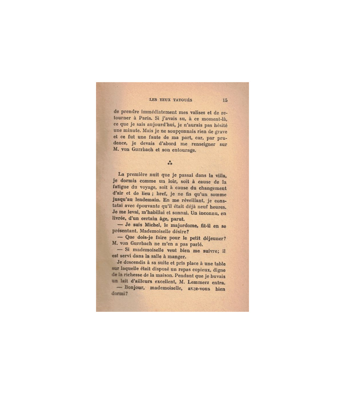 Il me semble revoir, à Grunewald, la villa assez grande qu'entourait un jardin, le visage pâle et tout ridé de M. von Gurrbach, son corps ratatiné dans son fauteuil roulant, et je crois entendre sa voix maladive et grincheuse. Jamais je n'oubliera ses yeux d'un gris pur, perçants et méfiants, ni la figure ridicule de l'adjudant Krabbe, ni les traits hideux et criminels de cet être sans scrupules qui s'appelait Kunz, pas plus que je n'oublierai la bonne Mme Gisela qui trouva une mort si soudaine.