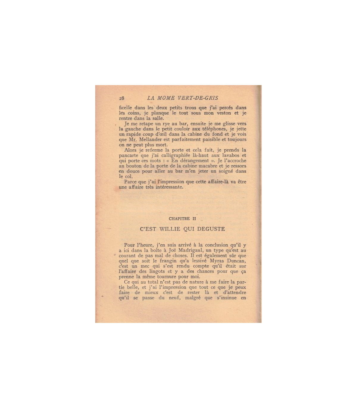 Il y a un tas de types qui se figurent que le boulot d'agent spécial c'est bon pour les macaques. Mais je vous jure que si on a affaire à un gars dans mon genre qu'aime bien que ça barde un peu de temps en temps et qu'en pince pour la variété, c'est un beau métier à condition d'être pas descendu le premier. Et quand par là-dessus on a une bouille à faire pâmer les gonzesses, parce que ça les change des mecs des ballets russes, le métier offre parfois de ces petits à-côtés pas négligeables du tout.. par exemple un plongeon gratuit dans l'East River avec un fer à repasser autour du cour. Il y en a pour tous les goûts, je vous dis.