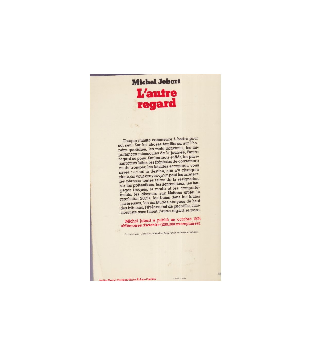 L'autre regard, Michel Jobert, 1976 - le Mulet de Machiavel - le nègre de Boulogne - sur un tableau de Dessons - une visite d'André Gomis - éloge du frêne - la Tour du Bon - les voyages pittoresques - Aïcha Kendicha - esclave en Lorraine - un voleur battu - actions de grâces - les mercenaires - Simourgh orange - cruautés mesquines - l'autre regard. éditons Grasset, 1976. #homme politique français, #essai politique, #biographie hommes politiques.