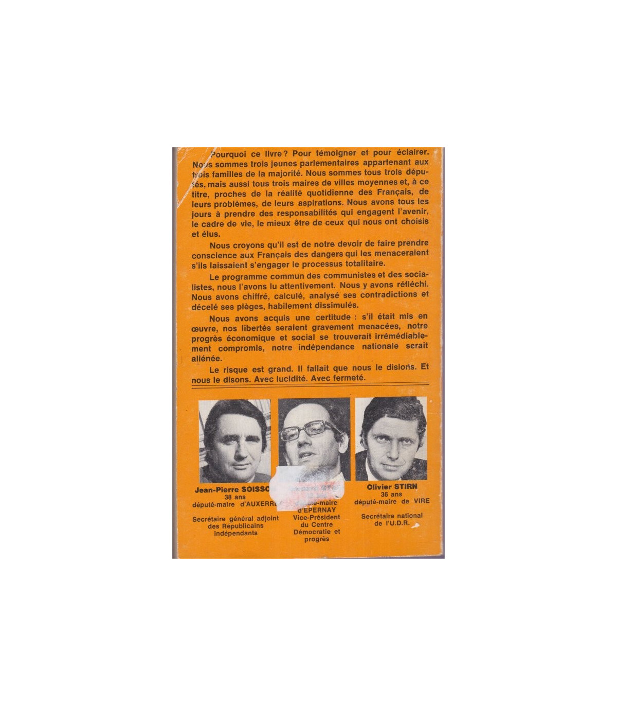 Format livre de poche, éditions France-Empire, 1973. #Jean-Pierre Soisson, #Bernard Stasi, #Olivier Stirn, #essai politique, #députés de Droite , #programme commun socialiste, #alliance socialistes communistes, #critique du socialisme, #François Mitterrand.