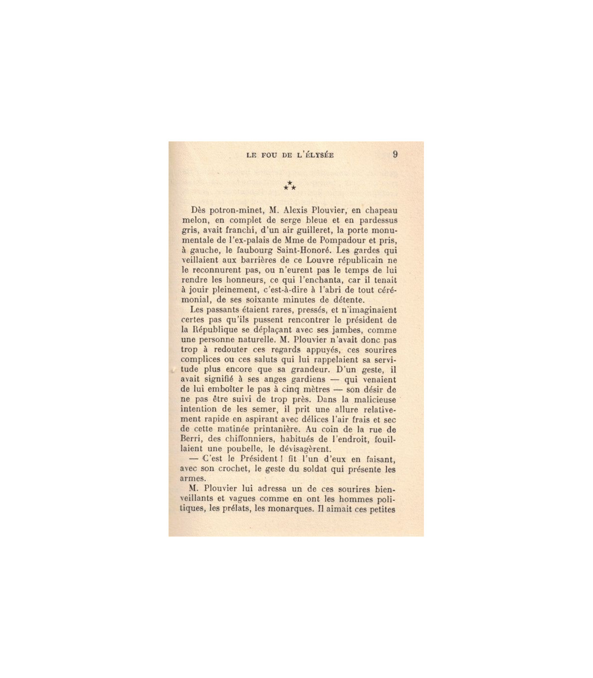 "Comme chaque matin, Alexis Plouvier, président de la République, sortit du palais de l'Elysée pour faire une promenade pédestre qu'il appelait la revue des poubelles.