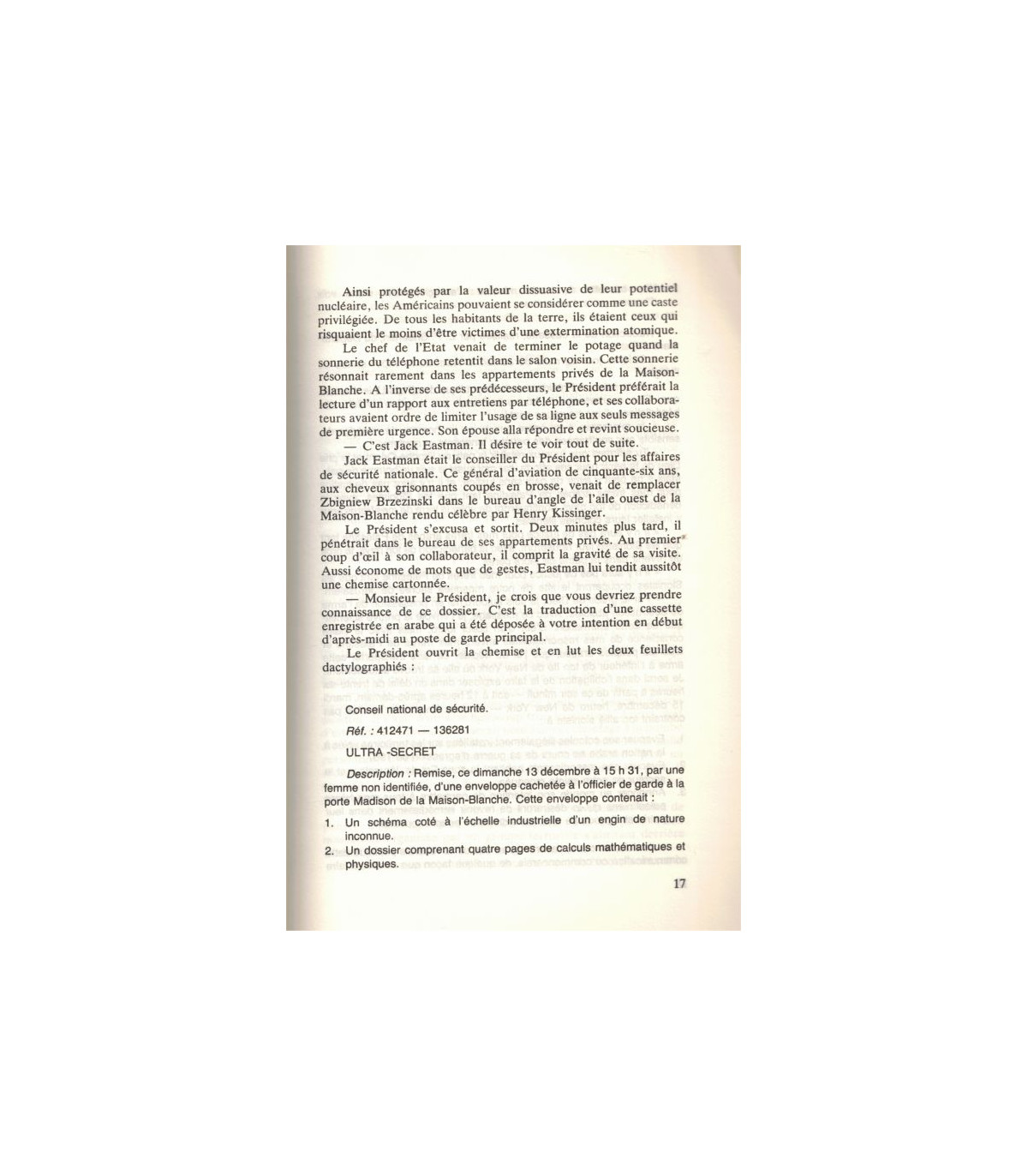 Il met en cause Carter, Begin, Giscard, Brejnev, Kadhafi; les as du F.B.I., les policiers de New York, les pickpockets de Manhattan, les agents du S.D.E.C.E. et de la C.I.A.; les colons "sauvages" de Samarie, les avants atomistes de Los Alamos, trois terroristes palestiniens, un aréopage de psychiatres, le satellite "Oscar...