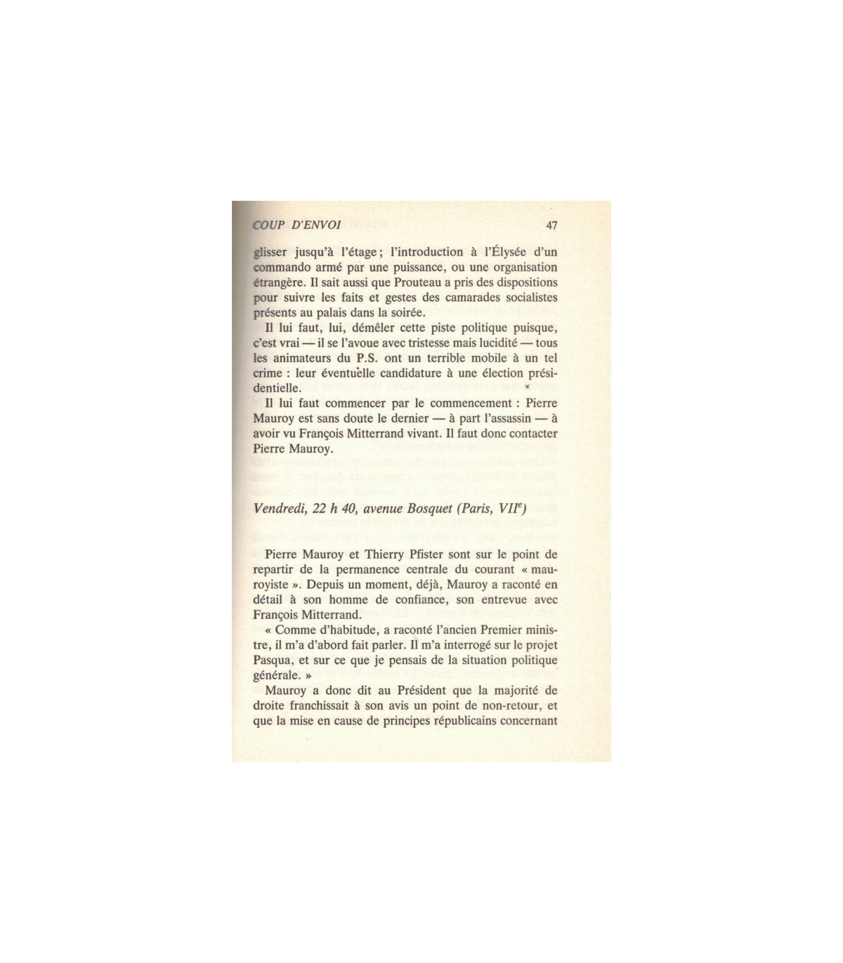 "Nuit tombante, un vendredi soir. Tout est calme dans l'appartement de Jacques Attali. Le conseiller spécial du Président de la République met la dernière main à son essai : Mécanique ondulatoire et systèmes politiques modernes quand le téléphone retentit. C'est Jean-Louis Bianco, le secrétaire général de la Présidence : "Jacques ? C'est très grave, arrive à l'Elysée tout de suite; passe par la grille du coq."