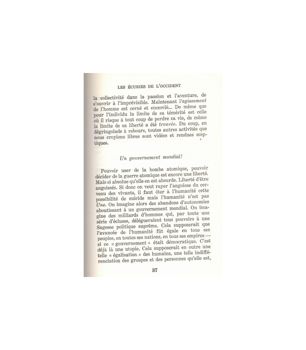 Le siècle est fou. Fou de lâchetés, de démissions, de mensonges, d'impostures et de laideur, et ce qu'on y appelle crise de civilisation n'est en vérité que le refus apeuré de toute hauteur. Je n'en pouvais plus. J'ai voulu témoigner. Il faut tout de même - lorsqu'un temps à venir s'étonnera de nos débâcles - que nos petits-neveux sachent que quelques soldats refusèrent de jeter les armes et de lever les bras.