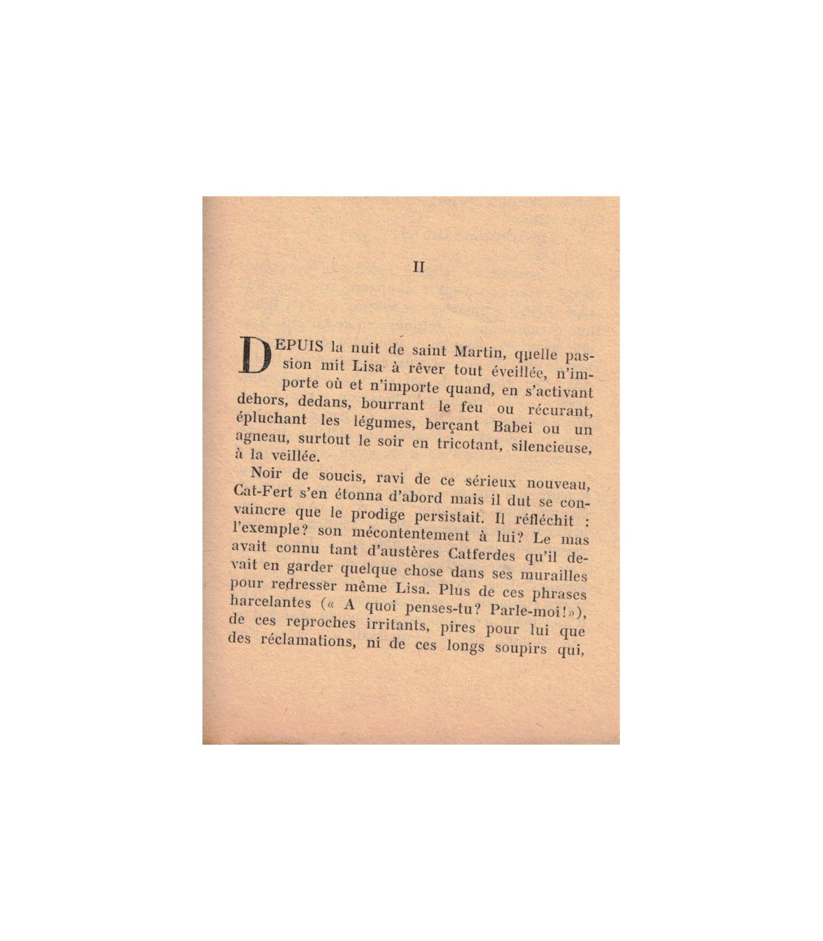 "Quel beau jour de la Saint-Martin, d'or et de nacre, sur la colline refleurie! De Roquemale, Lisa descendait au village, balançant à bout de bras le grand panier d'osier fermé où elle rapportait bas et chaussettes tricotés aux veillées pour la mercerie-confection de la bourgade. Le joli jour! La jeune femme chantonnait, si légère sur le cailloutis, si joyeuse!