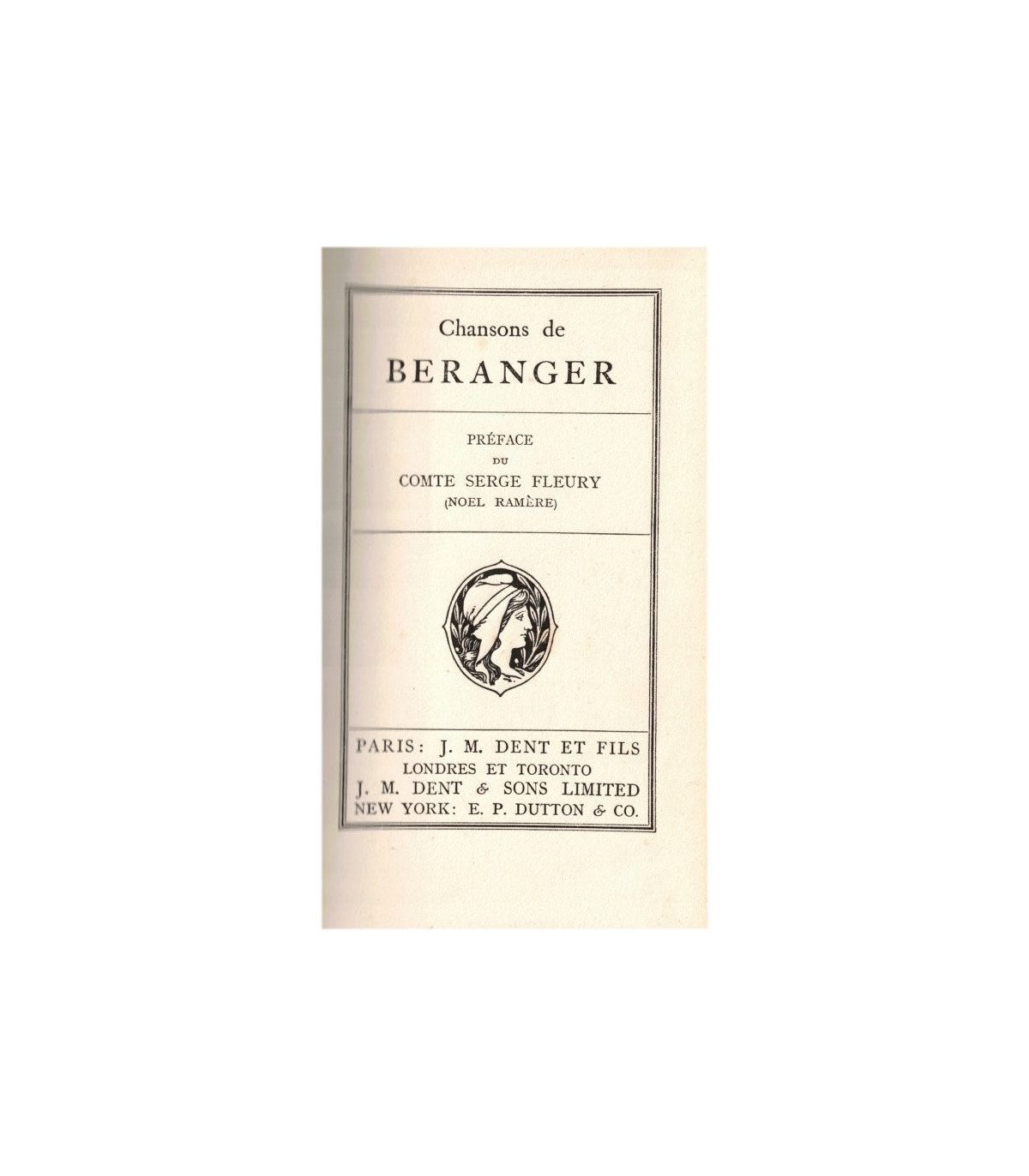 Les chansons de Béranger, Pierre Jean de Béranger - livre petit format avec une belle reliure dos cuir - Livre de la collection Galla - préface du Comte Serge Fleury (Noël Ramère) - Les bénédictions - le bonheur - les fous - le voyage imaginaire - les étoiles qui filent - le chapelet du bonhomme - l'oiseau fantôme - les quatre pages historiques - les voyages - les nègres et les marionnettes - le postillon - la prisonnière - mon jardin - la bonne vieille - souvenirs d'enfance - le vilain - les feux follets - le vieux vagabond - la nostalgie - le Juif Errant - les hirondelles - la pauvre femme - mon habit - les contrebandiers - le chant du Cosaque - le retour dans la Patrie - adieux à la campagne - l'orphéon - les orangs-outangs - le chasseur - le roi d'Yvetot - conseil aux Belges - le feu du prisonnier - à mes amis - le suicide - à M. de Chateaubriand - vieux habits, vieux galons - les escargots - le convoi de David le tombeau de Manuel - mes craintes - le nouveau Diogène - les échos - l'épée de Damoclès - une idée - le violon brisé - les souvenirs du peuple - le vieux caporal - les enfants de la France - le vieux sergent - le cheval arabe - le vieux drapeau - adieu chanson - le champ d'asile - les deux cousins - notre coq - l'aigle et l'étoile. Ouvrages à consulter, bibliographie. éditions J. M. Dent et Fils, Paris - Londres J.M. Dent & Sons Ltd. Sans date, vers 1900/1920. #poésie, #poètes, #éditions anciennes, #belles reliures, #reliure cuir, #chansonniers XIXe siècle, #chansons XIXe siècle, #poètes XIXe siècle, #poésie XIXe siècle, #écrivains XIXe siècle, #collection Gallia, #Gallia, #livre petit format, #éditions Dent, #livres petit format.