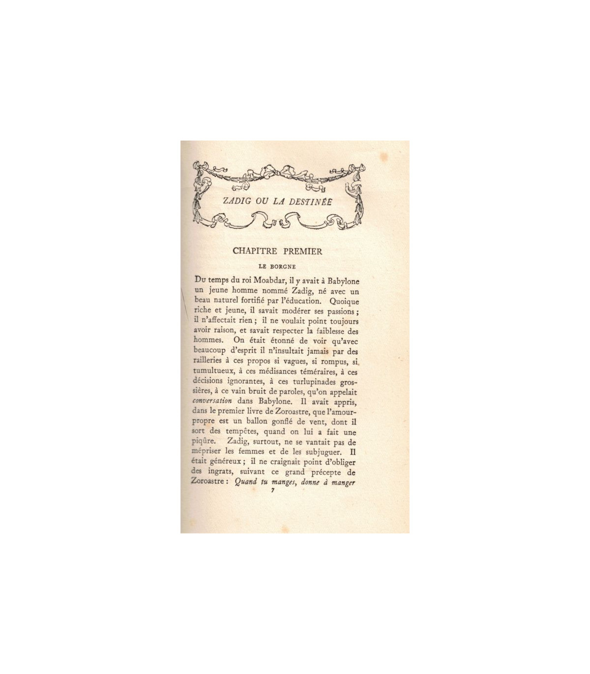 Préface de Gustave Lanson : "Dans l'œuvre immense de Voltaire, où tous les genres à peu près de la littérature sont essayés, ce qu'il y a de plus exquis, ce sont les romans et contes, avec tous ces dialogues, facéties, et gaietés qui sont des jets de la même verve. Ce sont des chefs d'œuvre de l'art du XVIIIe siècle, fins, spirituels, impertinents, lestes, avec une pointe de volupté gaillarde. Il faut pour les goûter s'être empli les yeux et l'esprit de la couleur de l'art de ce temps-là, savoir goûter Watteau et Fragonard Cochin et Baudouin, un boudoir de Trianon ou le salon ovale de l'Hôtel Soubise. Un tour à la Collection Wallace est, pour un Anglais, la meilleure introduction à la lecture des Contes de Voltaire. Il y sentira l'âme du siècle qui partout, dans un meuble comme dans un livre de philosophie, voulait ces deux choses : l'esprit et le plaisir.