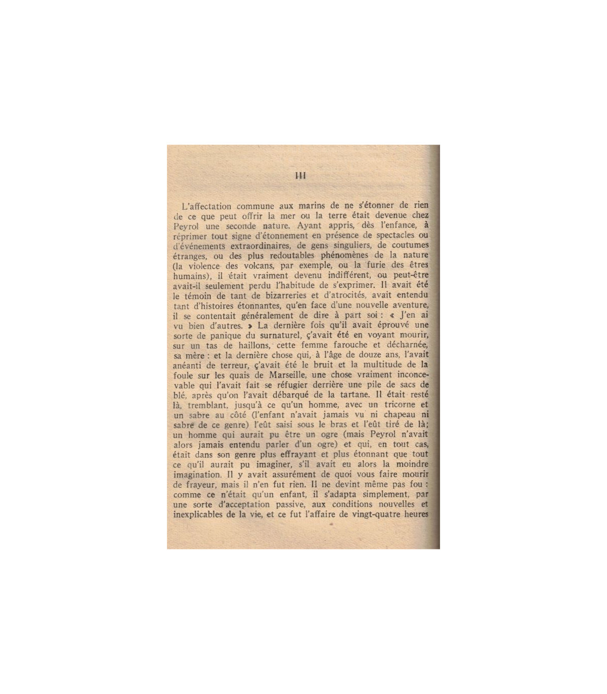 Mais, à vrai dire, le vieux Peyrol avait été prêt, dès le premier jour, à faire sauter son précieux bâtiment, et cela sans la moindre émotion, car tel était son caractère formé sous le soleil des mers de l'Inde au cours de combats plus ou moins légitimes où l'on se disputait un butin dissipé aussitôt qu'obtenu au prix d'une vie presque aussi précaire et remplie d'avatars, et qui n'avait pas duré moins de cinquante-huit ans.