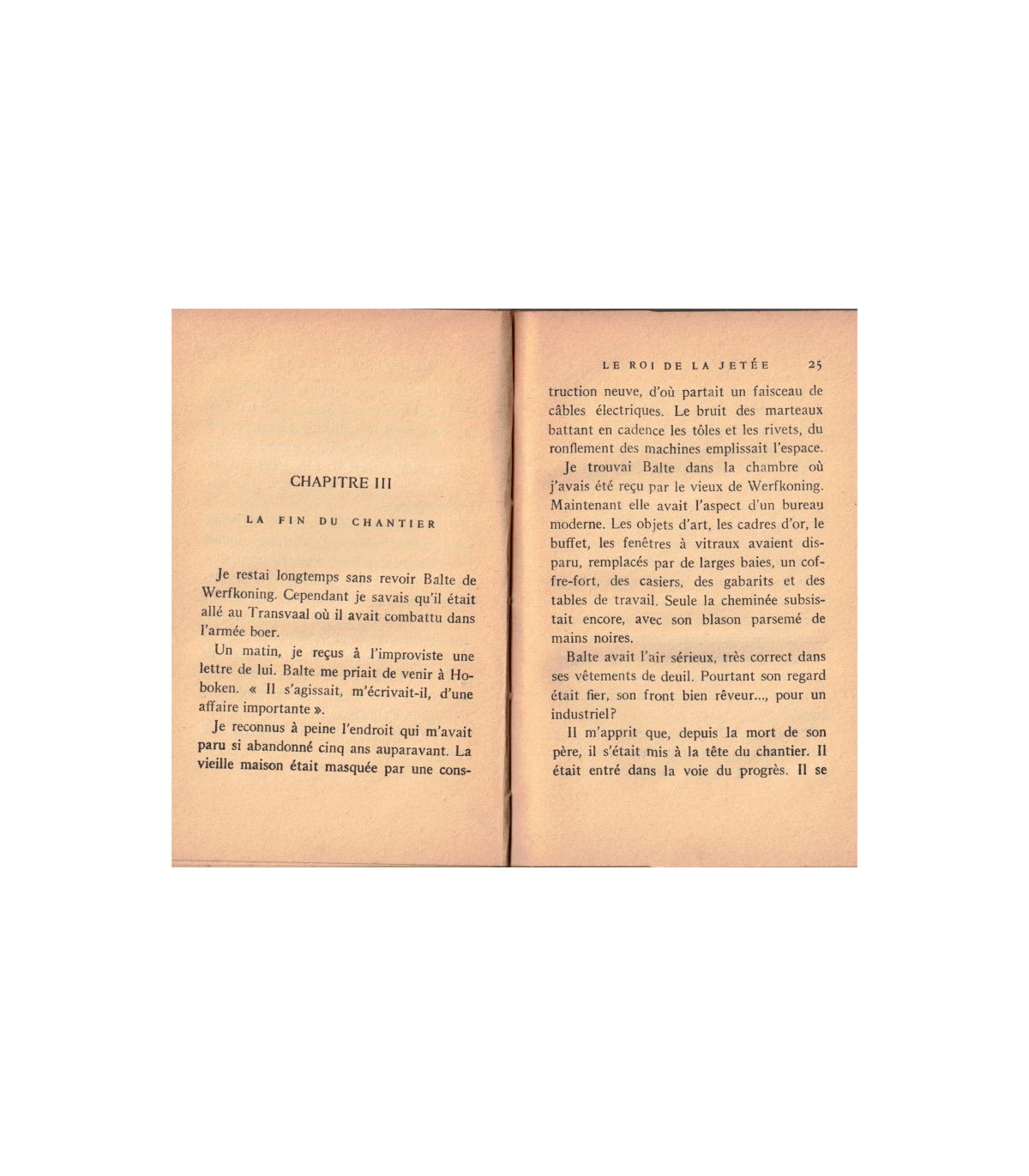 Au tournant du fleuve surgissait une forêt de cheminées, hautes et fumantes . Cela me rendit soucieux. Je craignais m'être embarqué pour un voyage inutile. Pourtant mes renseignements étaient précis. Fondé en 1580, le chantier des Werfkoming était célèbre à Anvers: on n'y construisait plus que des bâtiments de petit tonnage, mais la maison avait gardé intacte sa réputation et toute sa clientèle de mariniers et de pêcheurs.