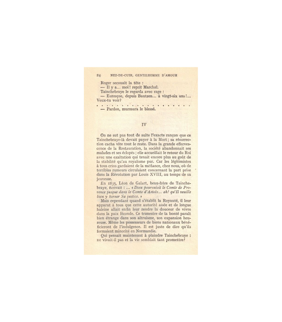 Défunt-Nez-de-Cuir survit dans la mémoire des humbles comme un grand trouble historique. Il y a trente ans nulle hiloire paysanne de force, de guerre ou d'amour, ne se passait de lui, de sa forme vigoureuse et mutilée.