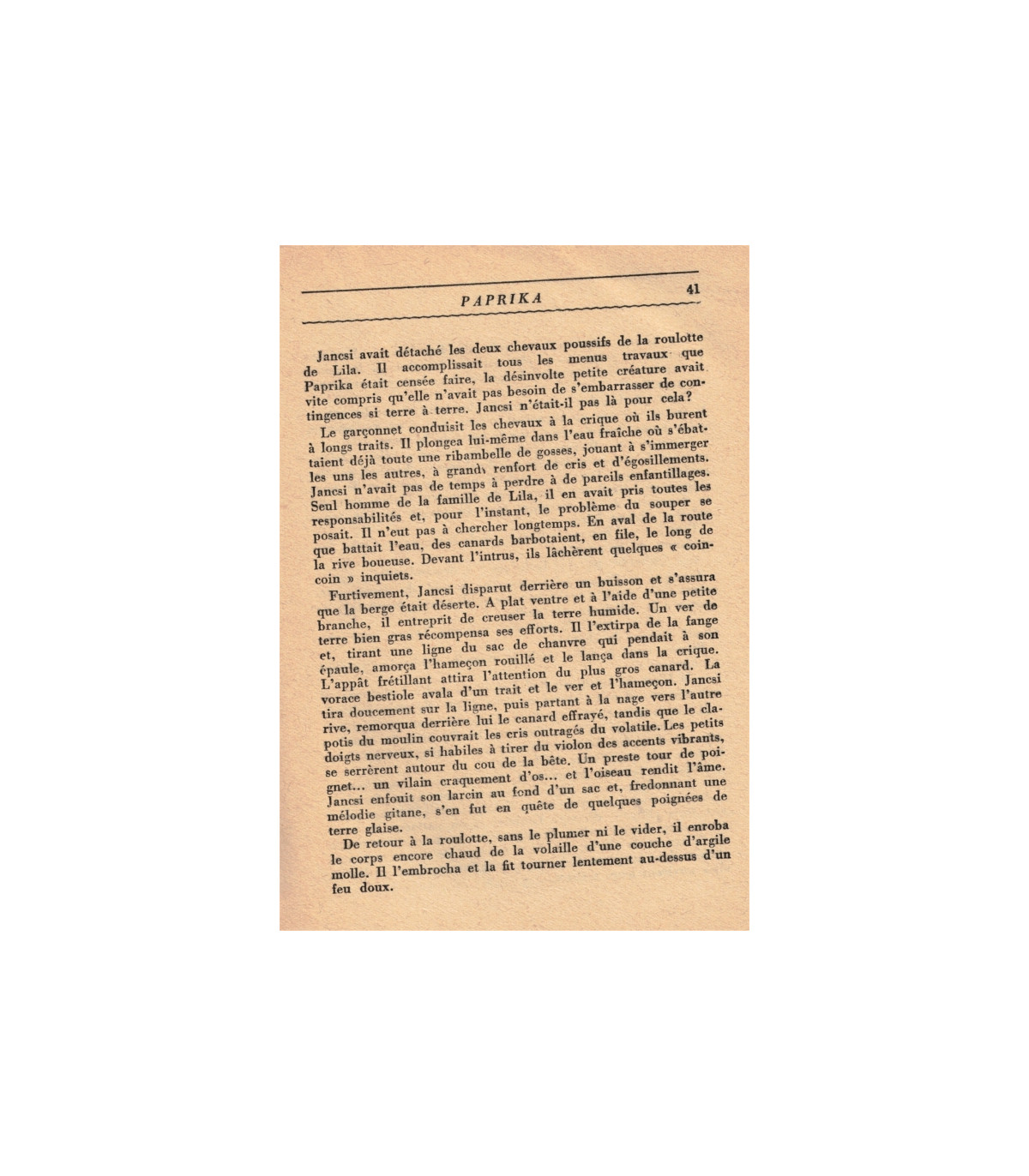 "Paprika, la foudre et les éclairs célèbrent ta naissance, la foudre et les éclairs t'accompagneront jusqu'à la mort !".Ainsi parla la vieille et très sage Zsuzsa. Puis la voyante centenaire se pencha lentement sur la famille de la reine des Tziganes et reprit à voix basse : "Paprika, je voie sur ton chemin un sabre, une fusil et du sang, je vois aussi beaucoup d'hommes et un roi ..."A ces mots, la pluie cesse brusquement de tomber sur le camps des gitans illuminé par l'orage et, seuls dans le ciel, se prolongèrent quelques instants encore les roulements faiblissants du tonnerre.