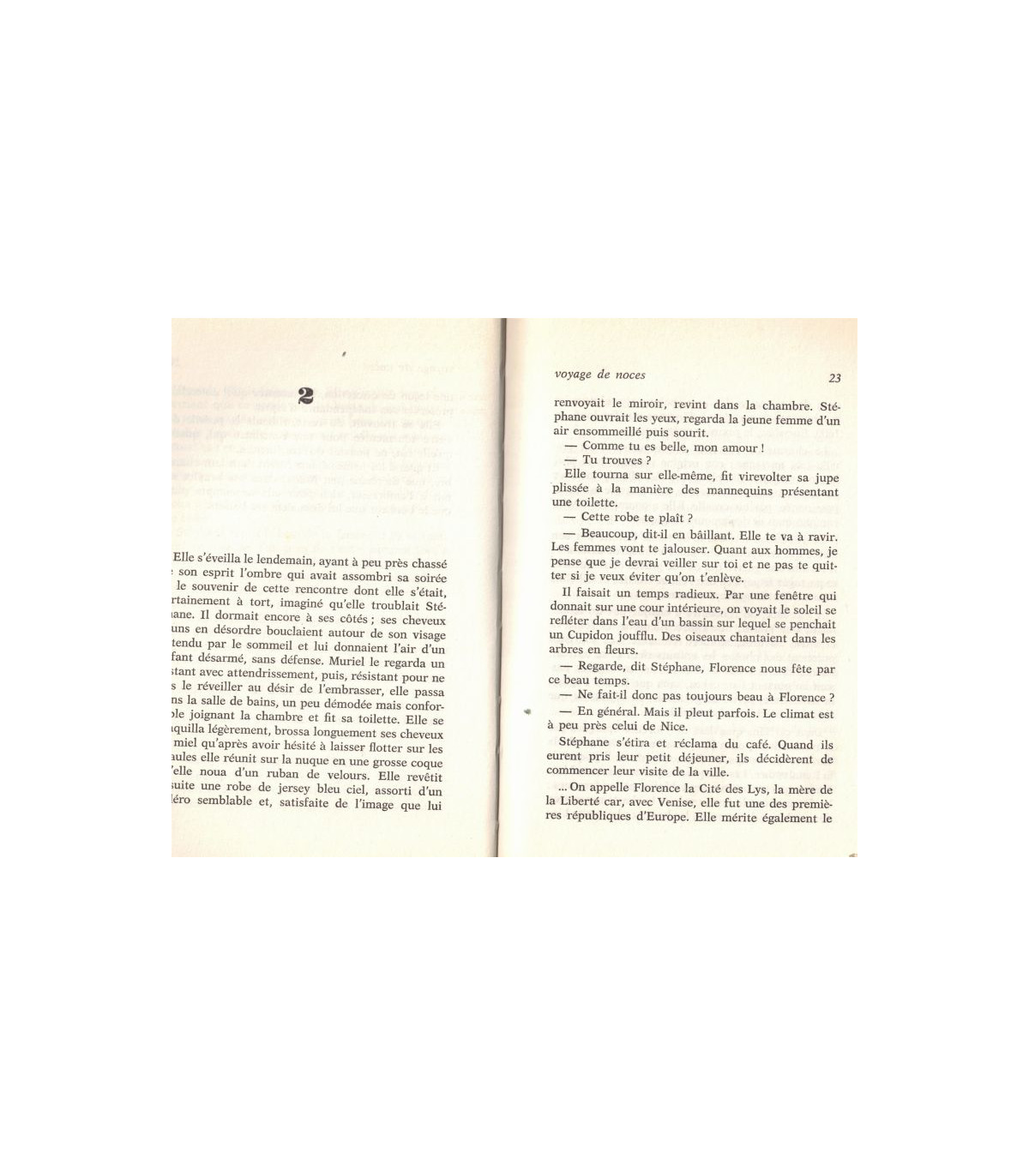 Ils s'appelaient Stéphane et Muriel Carlier, étaient mariés depuis trois jours et faisaient leur voyage de noces dans la petite voiture de Stéphane, s'arrêtant selon leur caprice aux endroits qui leur plaisaient avec, pour étape finale, Florence, la cité des lys, que Muriel désirait visiter depuis longtemps et où, justement, habitaient des parents de Stéphane qui, par sa mère, morte, avait une lointaine ascendance italienne."