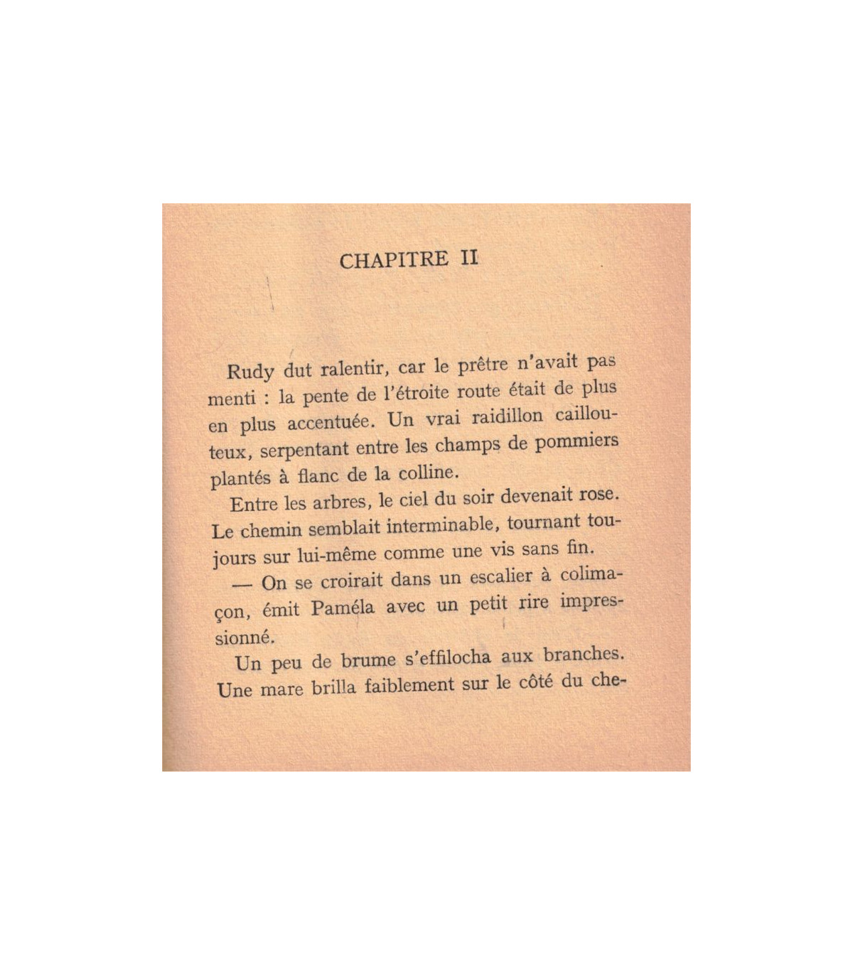 Il se saisit du papier malencontreux et, aussitôt rassuré, sourit. - Ce n'est pas un procès-verbal. C'est une réclame d'hôtel. Ils ont de la méthode, dans ce pays. (...) Elle lut tout haut, d'une voix enjouée et pleine d'allégresse : "A 14 kilomètres, Manoir des Chênes, hôtes payants, panorama splendide sur la forêt. Prendre la direction de Saint-Gingolph."