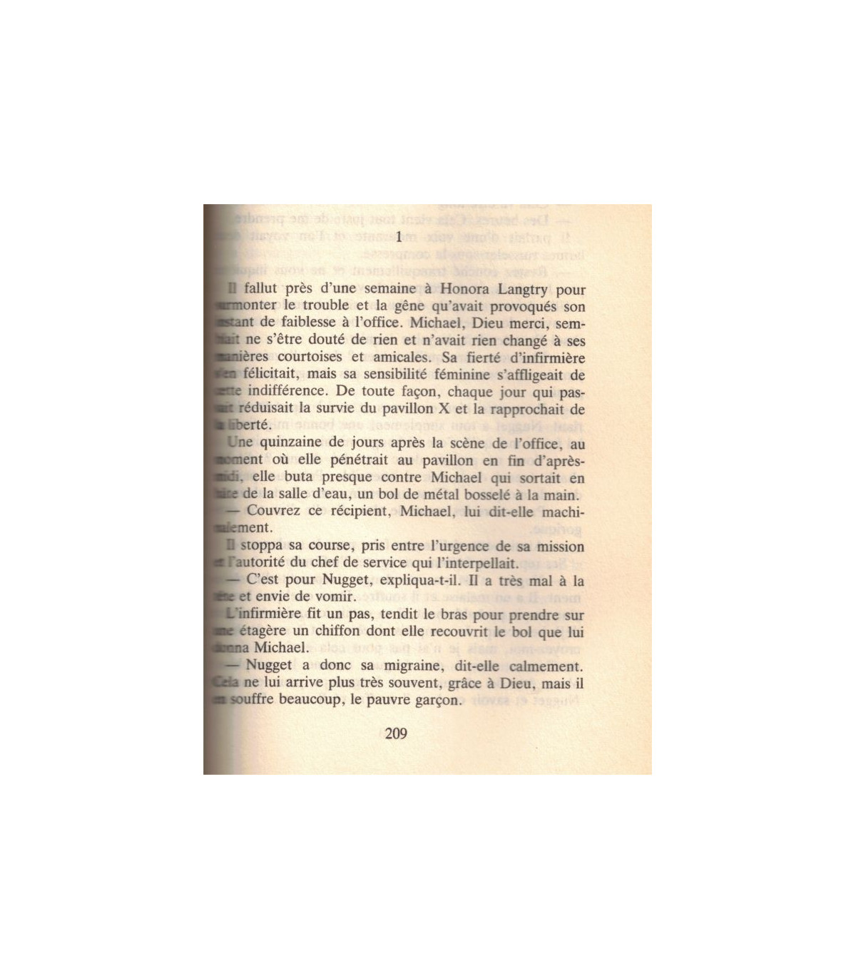 Colleen McCullough a choisi de décrire un cas de conscience : celui d'une infirmière qui a en charge, dans un hôpital de campagne perdu au fond d'une île du Pacifique, six soldats traumatisés par la guerre.