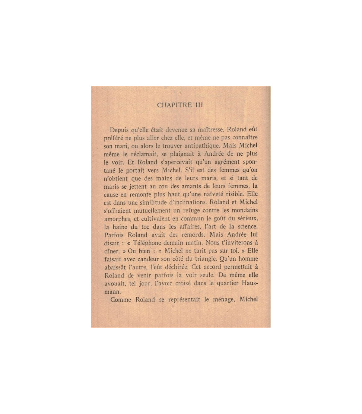 A Paris, M. Ferrand connaissait peu de monde. Mais par goût d'enseigner autant que pour augmenter ses ressources, il donnait des leçons particulières. Un de ses élèves de Condorcet ayant perdu un an dans une maladie, en trois mois il le remit en ligne. Une ébauche de relations s'ensuivit avec la famille. Ces Langelier étaient de grands bourgeois. (...) Andrée, deux ou trois fois, fut invitée, reçue avec tendresse par la mère, entourée de ses quatre filles et de quelques-uns de ses neveux et nièces. (...)