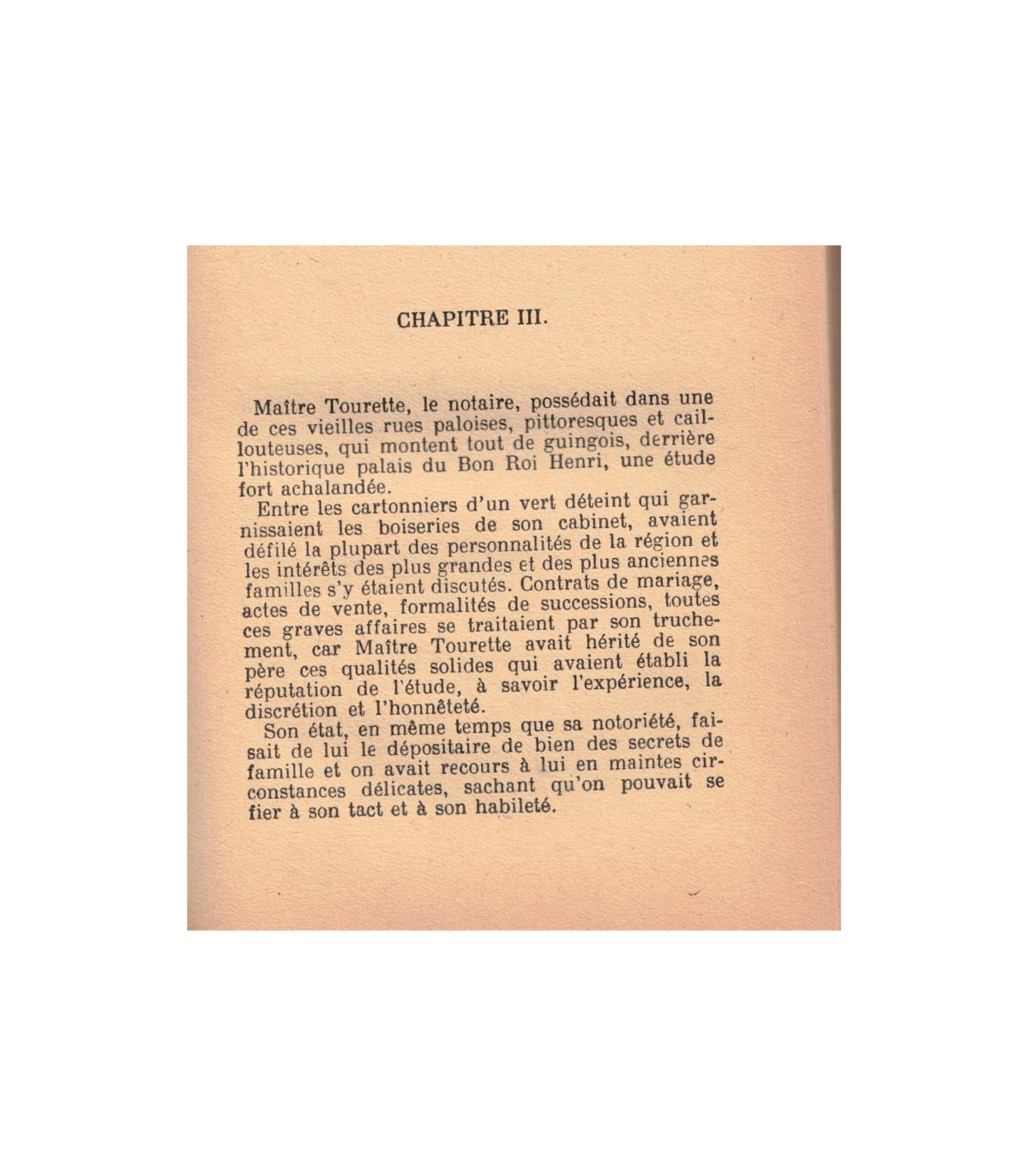 "A quelques kilomètres du délicieux petit village de Sauveterre, dans ce pays charmant de Béarn où les montagnes, perdant toute leur âpreté, sont plus vertes et plus fraîches qu'ailleurs, le manoir d'Ornaison élevait ses tours de pierre grise, habillées de jeune verdure. C'était une gentilhommière de l'époque Louis XIII qui avait grand air avec son parc vénérable, planté de châtaigniers et de vieux ormes, et le pont archaïque qui précédait l'arche de pierre de l'entrée. (...)