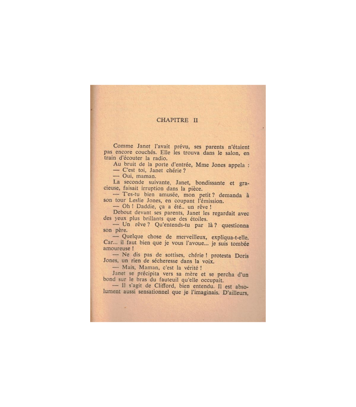 "Ce jour-là, la Société Londonienne Cinématographique Falcon donnait un cocktail à l'hôtel Savoy pour fêter la venue de Clifford Hurst, star américaine de première grandeur débarquée de la veille seulement. L'acteur devait être la vedette d'un film tourné en Angleterre. Sa réputation internationale avait attiré une foule énorme. Cà et là, dans l'assistance, on pouvait reconnaître quantité de comédiennes et de comédiens en vogue. Clifford Hurst en personne se tenait près de la porte d'entrée pour aider Ben Milton, l'agent de publicité de la firme, à recevoir les invités qui arrivaient. Mais ce rôle d'hôte semblait lui déplaire car il ne tarda pas à se retirer dans un coin discret, près d'une immense fenêtre où Jessie Payne, la doyenne des comédiennes présentes, l'accueillit par de gais reproches.