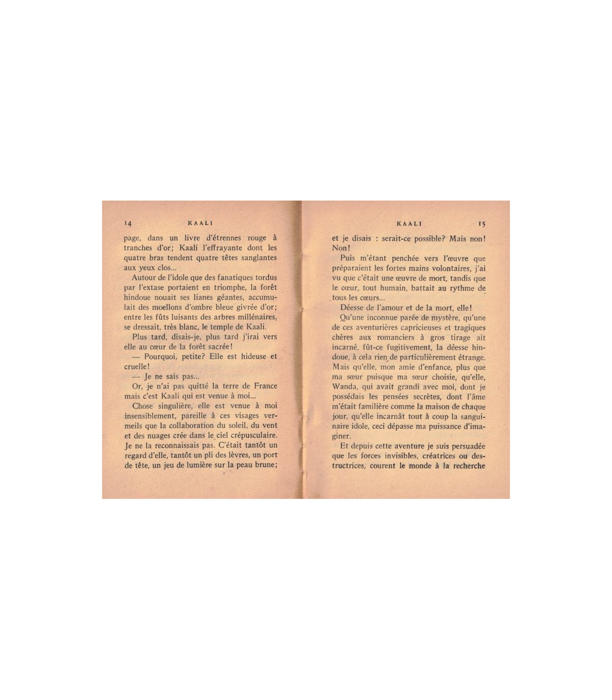 Autour de l'idole que des fanatiques tordus par l'extase portaient en triomphe, la forêt hindoue nouait ses lianes géantes, accumulait des moellons d'ombre bleue givrée d'or; entre les fûts luisants des arbres millénaires, se dressait, très blanc, le temps de Kaali.