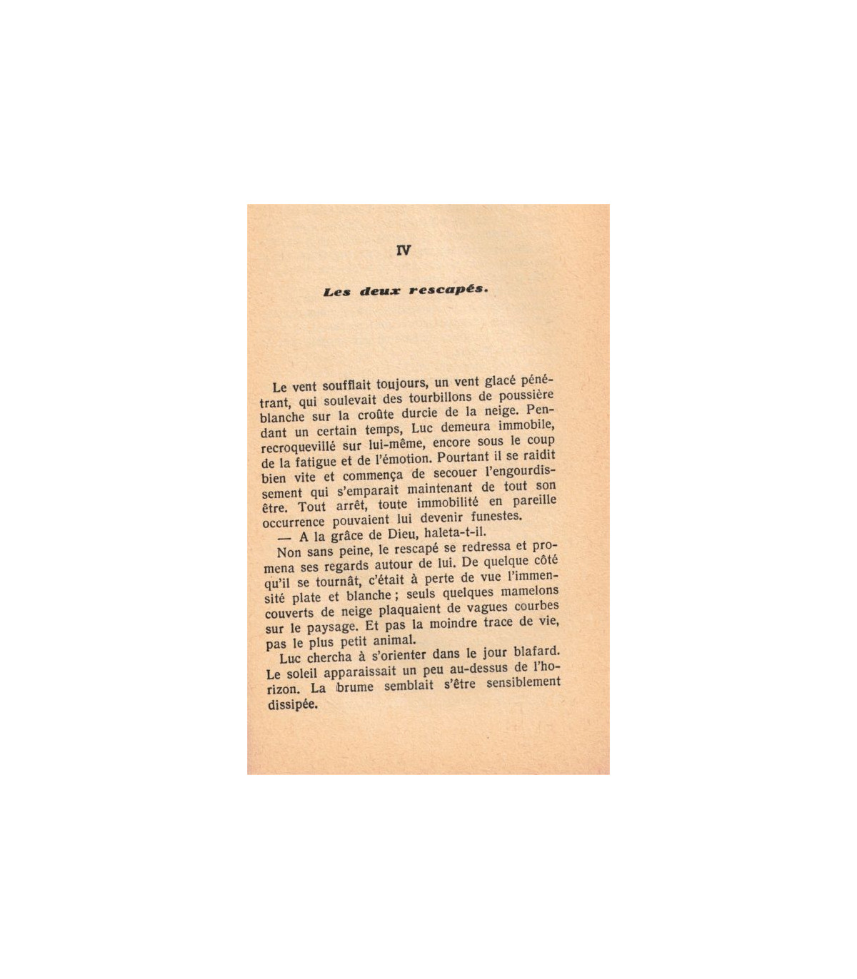 Sur le seuil du baraquement qui lui tenait lieu de bureau, le P. Grégoire, des Oblats de Marie-Immaculée de Chesterfield, tendait sa main grande ouverte à un solide gaillard au visage bronzé qui venait d'arrêter on traîneau et qui s'approchait d lui, les vêtements encore tout poudrés de neige. (...)