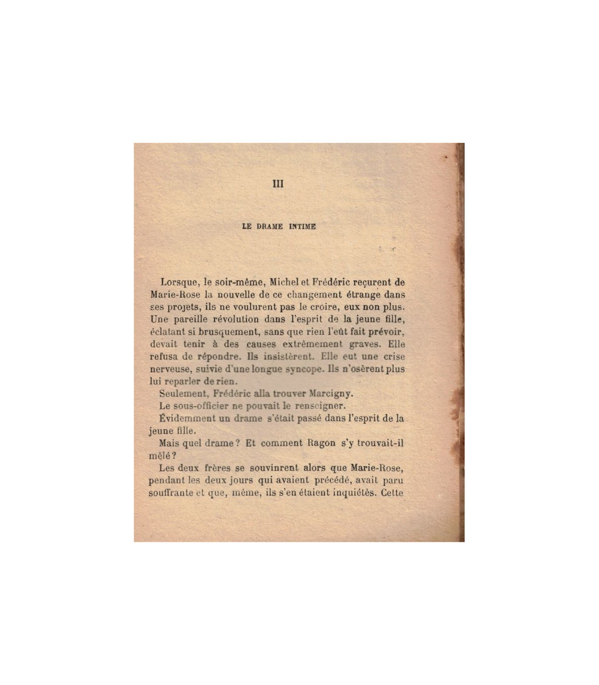 "Troisième partie, Mortel outrage. L'héritage du Vieux Ragon. La vieille, assise sur un escabeau, se chauffait devant un feu de branches de sapin lorsqu'on frappa rudement à la porte. Elle se dressa.