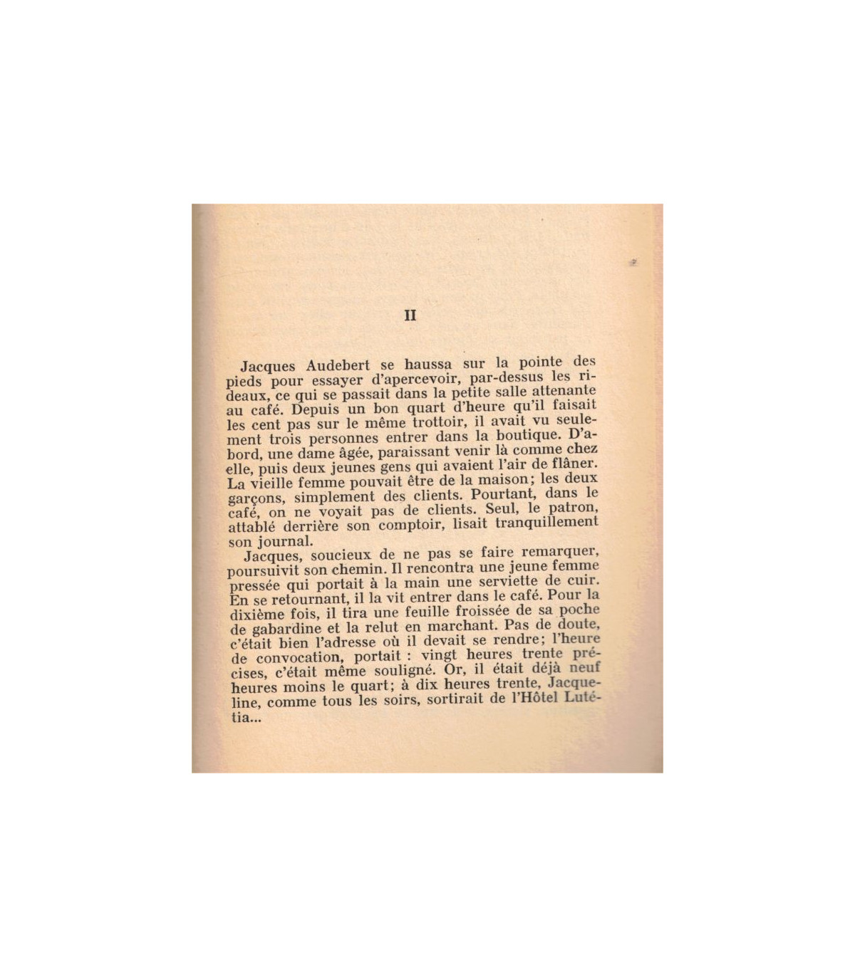 D'un air amusé, elle regardait, à travers la vitrine, l'embouteillage du soir : la circulation bloquée sur le boulevard, un cycliste se faufilant avec son chargement de journaux à traves l'enchevêtrement des voitures, la foule se précipitant vers la plateforme d'un autobus bondé, les gens courant sur les trottoirs..